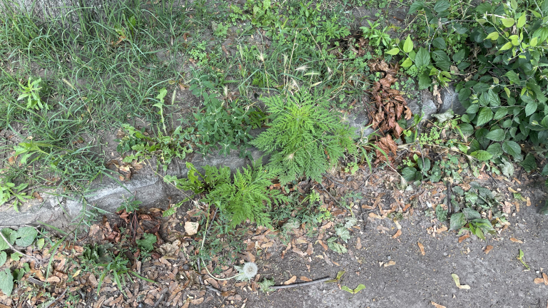 A kis parkrészben nincsenek gondozva a növények. Ennek következtében burjánzik az invazív bálványfa és zöldell a parlagfű.