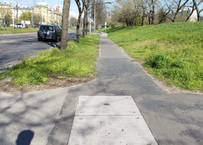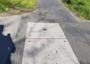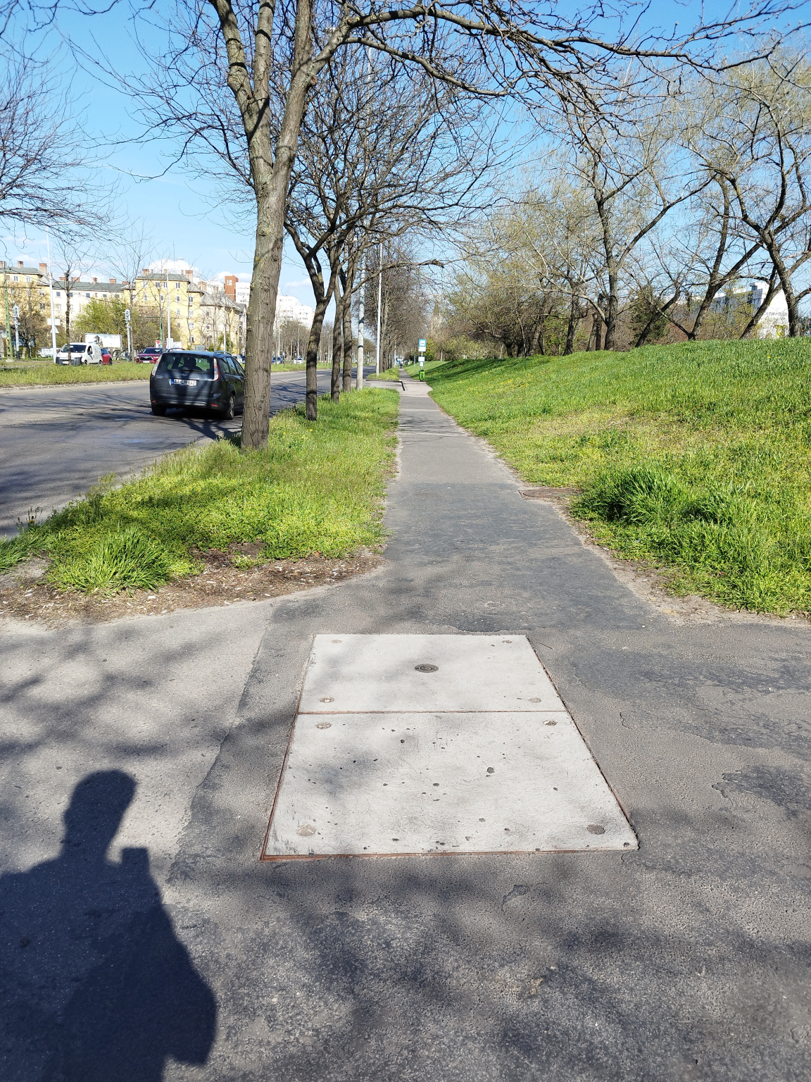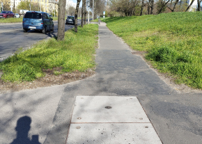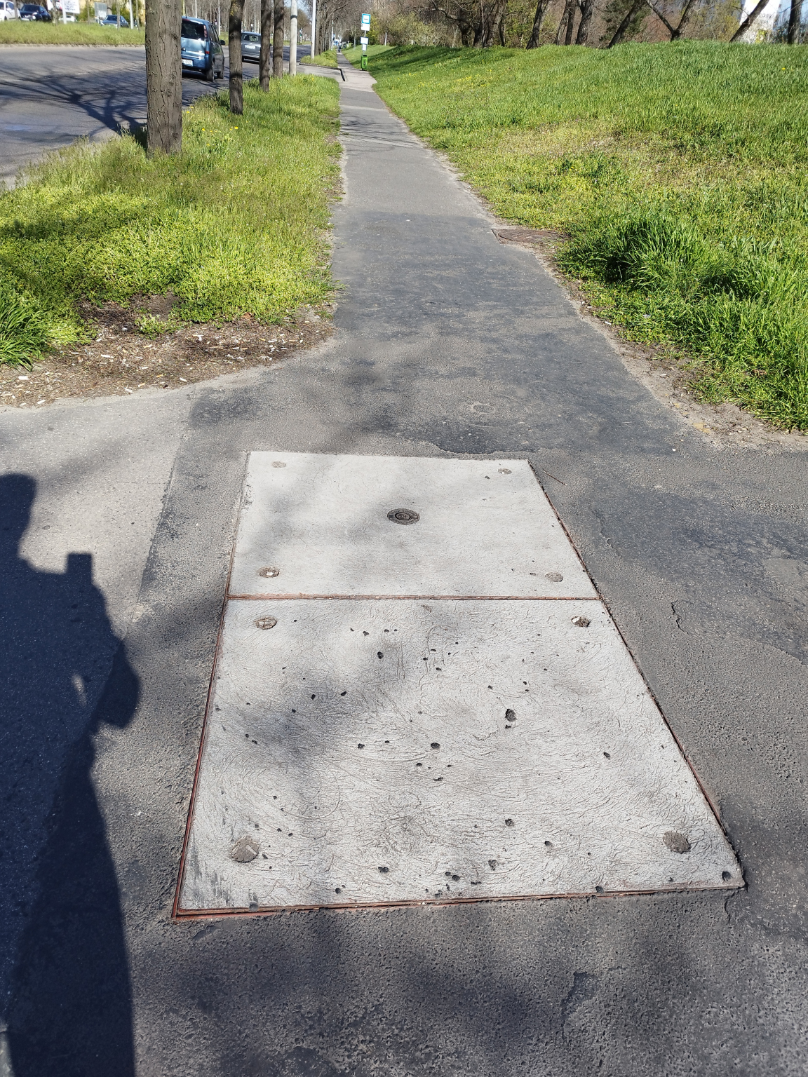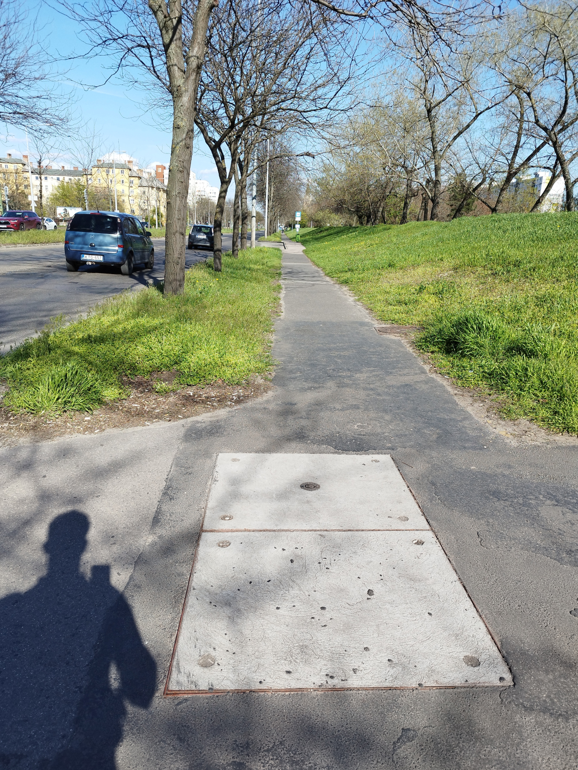 A Kerepesi úton a gyalogátkelőnél lévő fedlap széle letört, és a kerete körül a járda széttört.