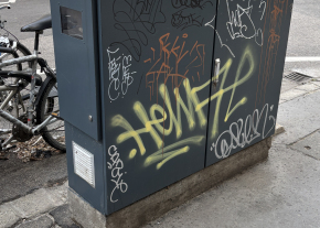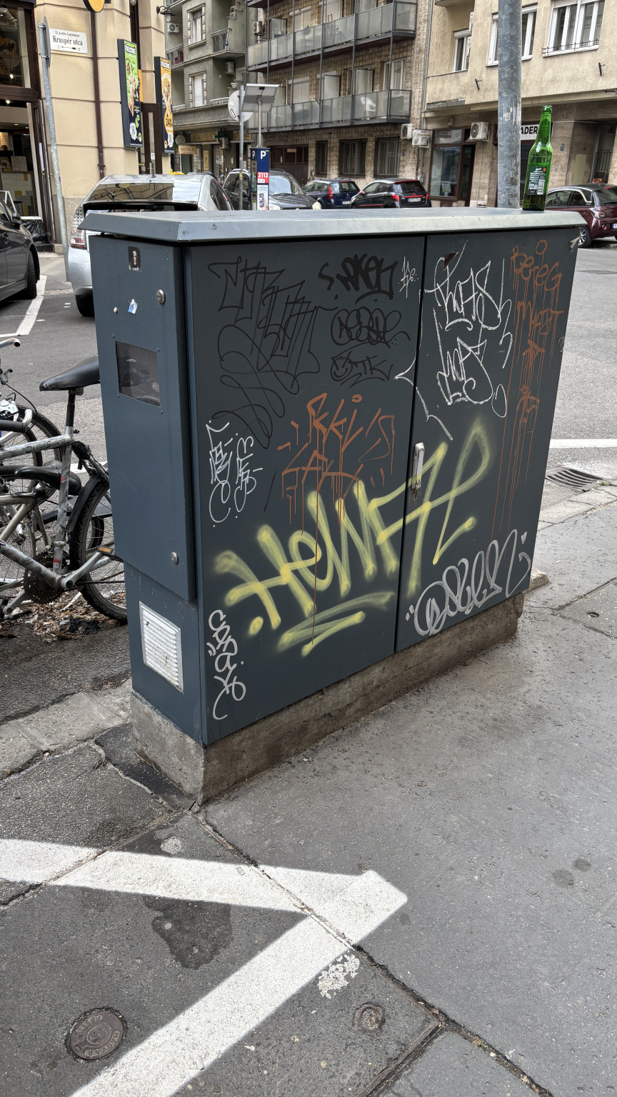 A Kruspér utca - Budafoki út sarkán lévő közműszekrény erősen graffitis, illetve csikkgyűjtőként is használt.