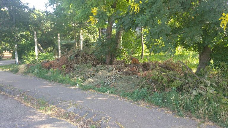Nagy kupacokban gyűlik a környékbeli házakból kihordott zöldhulladék. A korábban itt álló "Hulladék lerakása tilos" táblát sem pótolták még.