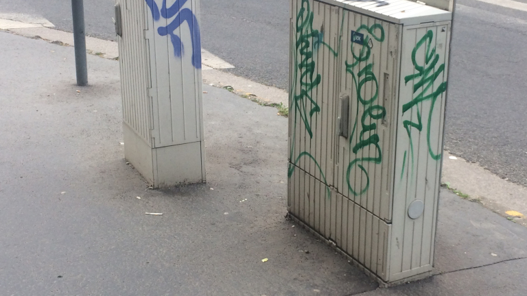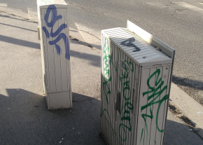 Jelzett helyszínen lévő mindhárom közműszekrény rongált, graffitis.