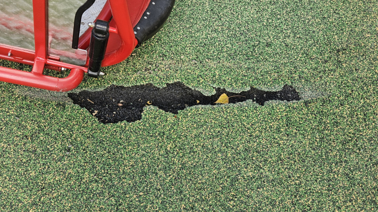 A 10.keruleti Ó hegyi játszótéren a mozgássérült hinta alatt megserult a gumi padló.