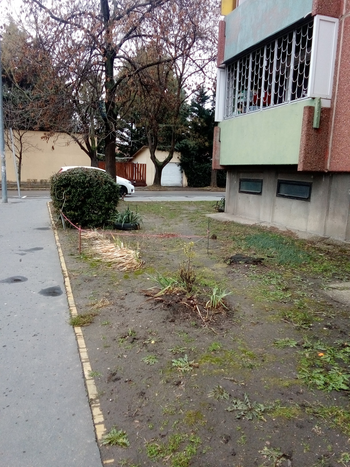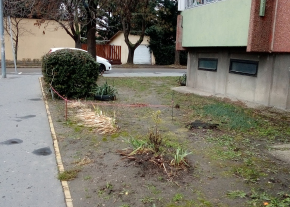 1116 Budapest, Sáfrány utca 40 társasház Herend utca felöli kertrészben kiálló vasrudak és gumiabroncsok vannak.