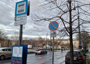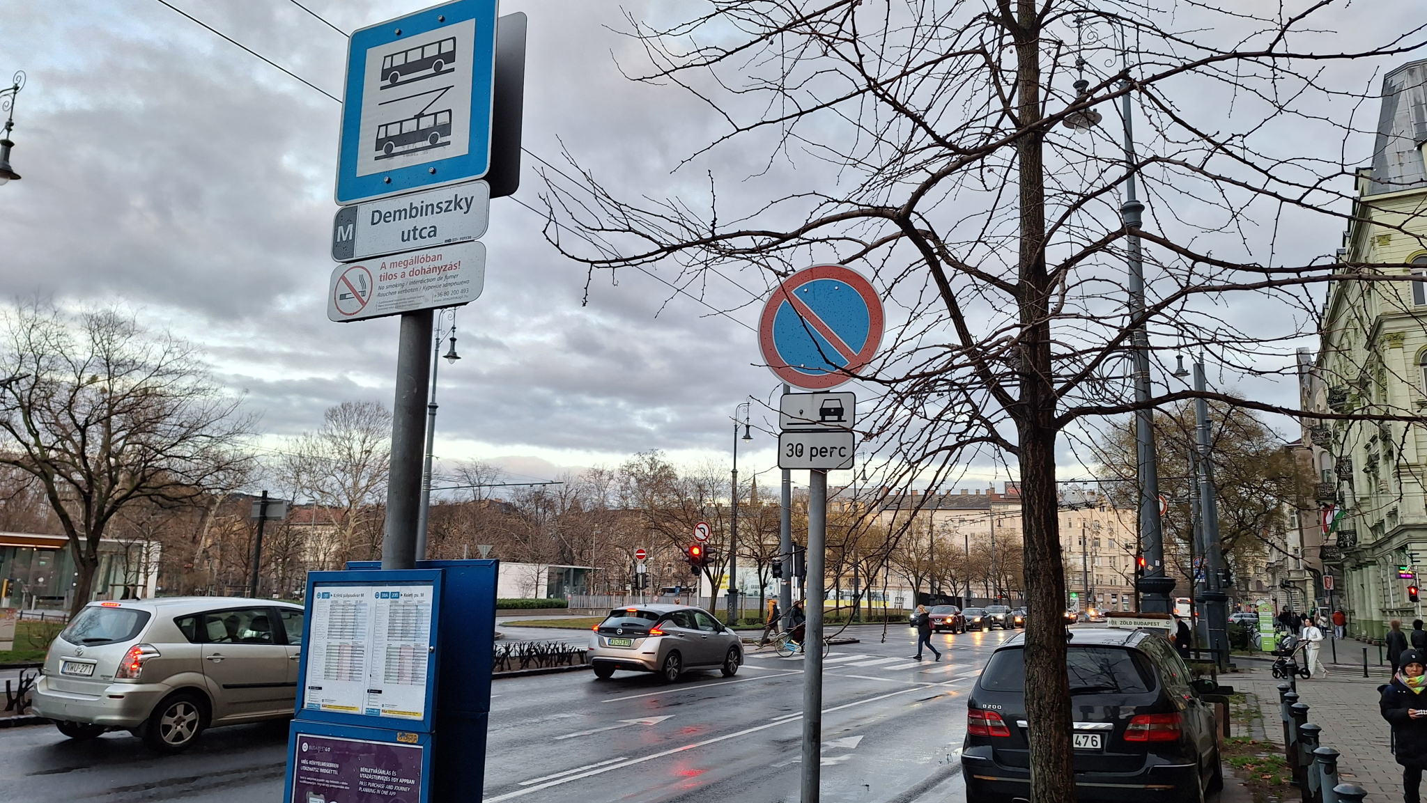 A Dembinszky utcai buszmegállónál lévő várakozási tábla erősen kopott.