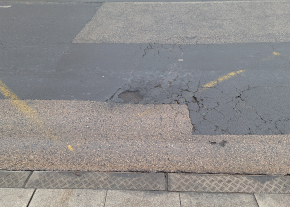 A 7-es busz Blaha Lujza téri megállójában az aszfaltburkolat töredezett, kátyúsodásnak indult.