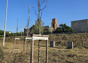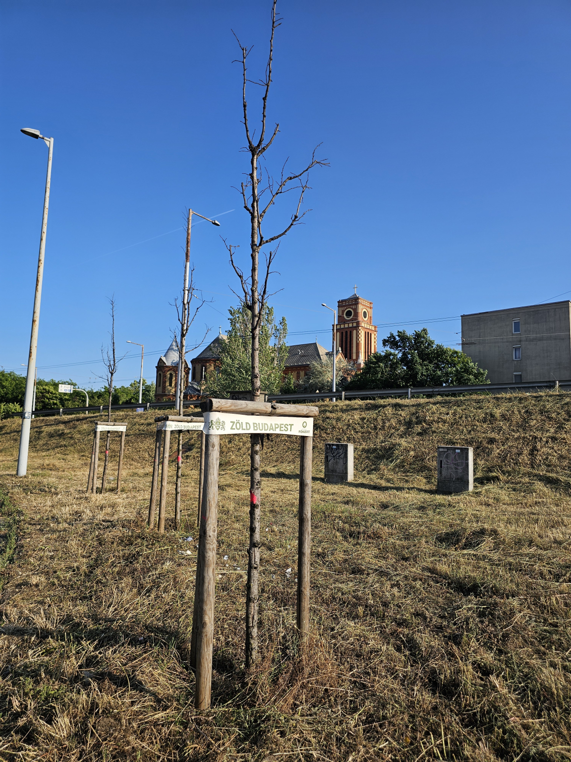 Kassai téren, a felüljáró északi tövében 3 facsemete kiszáradt. A felirat alapján a FŐKERT ültette őket.