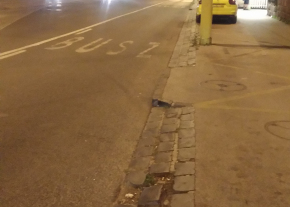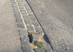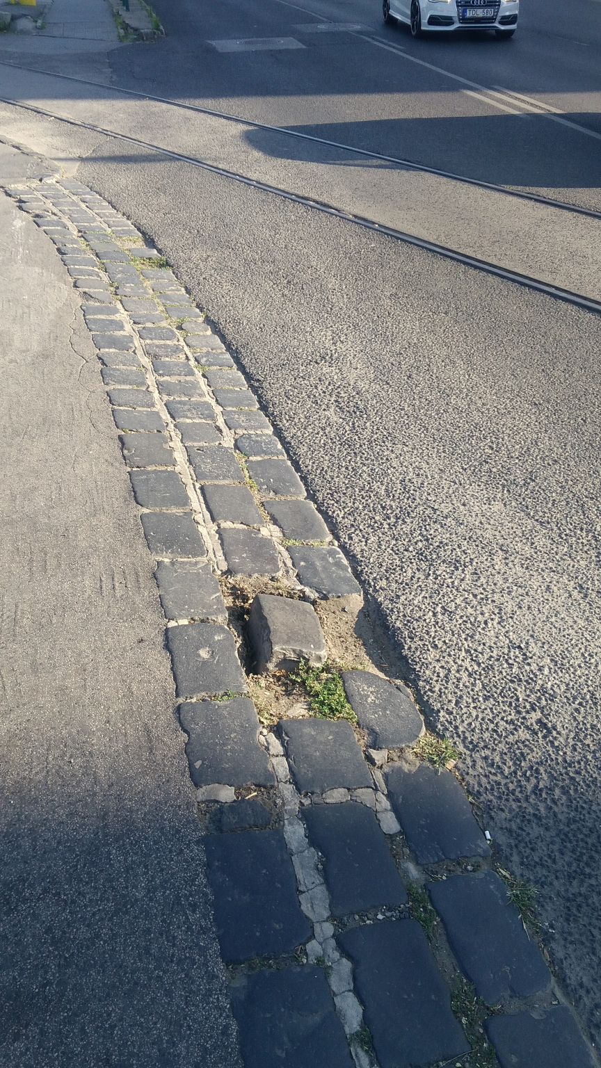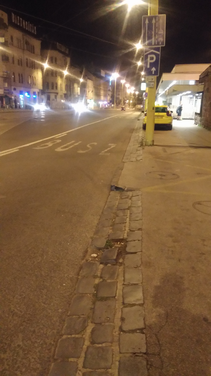 A taxisdrosztnál az egyik macskakő kiesett és félredobták, kérem, tegyék vissza a helyére!