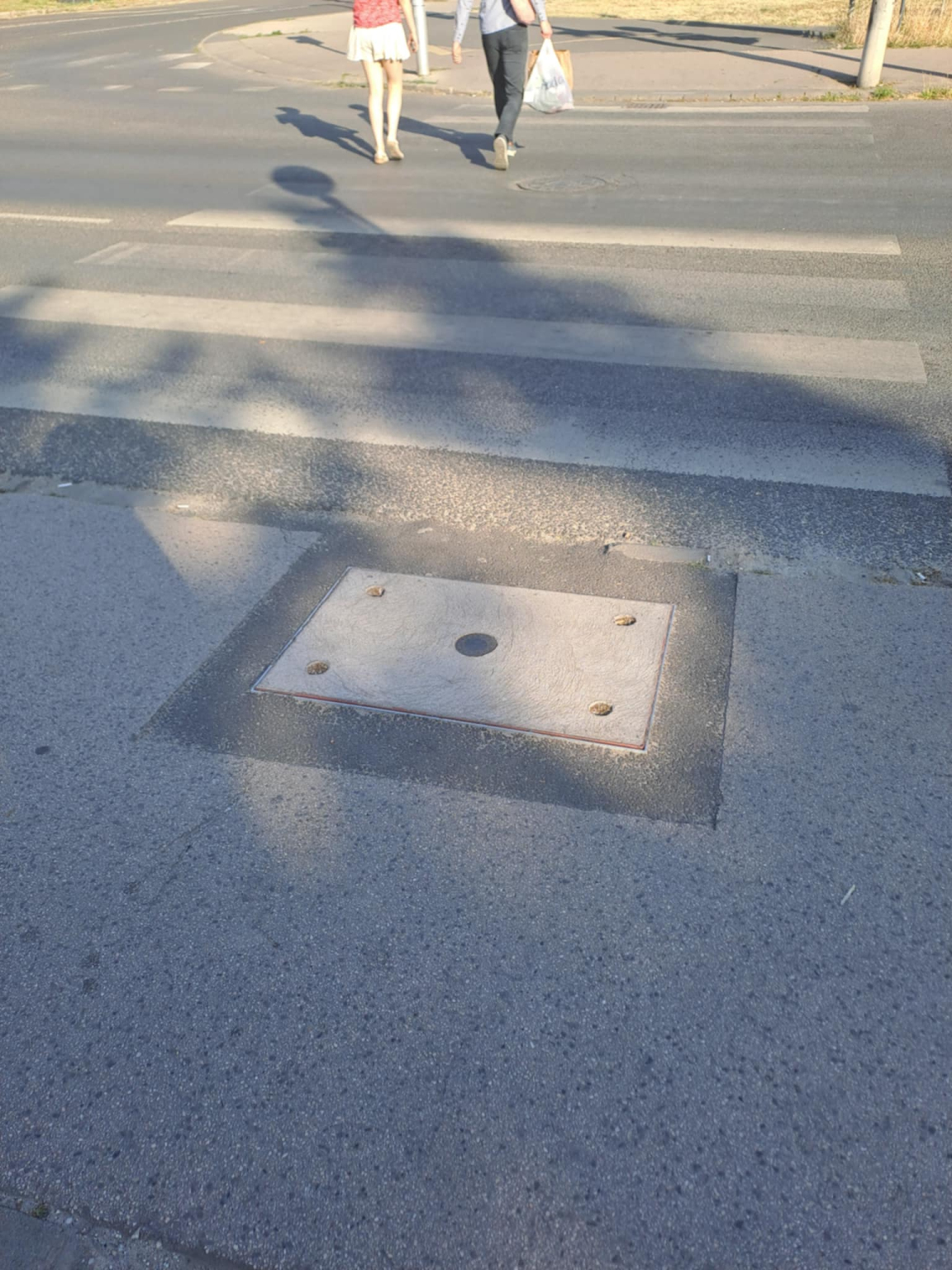 A Nagytétényi és a Közgazdász utca kereszteződésénél lévő zebra közepén, a járdaszigeten van egy erősen porladt forgalomirányítási aknafedél.