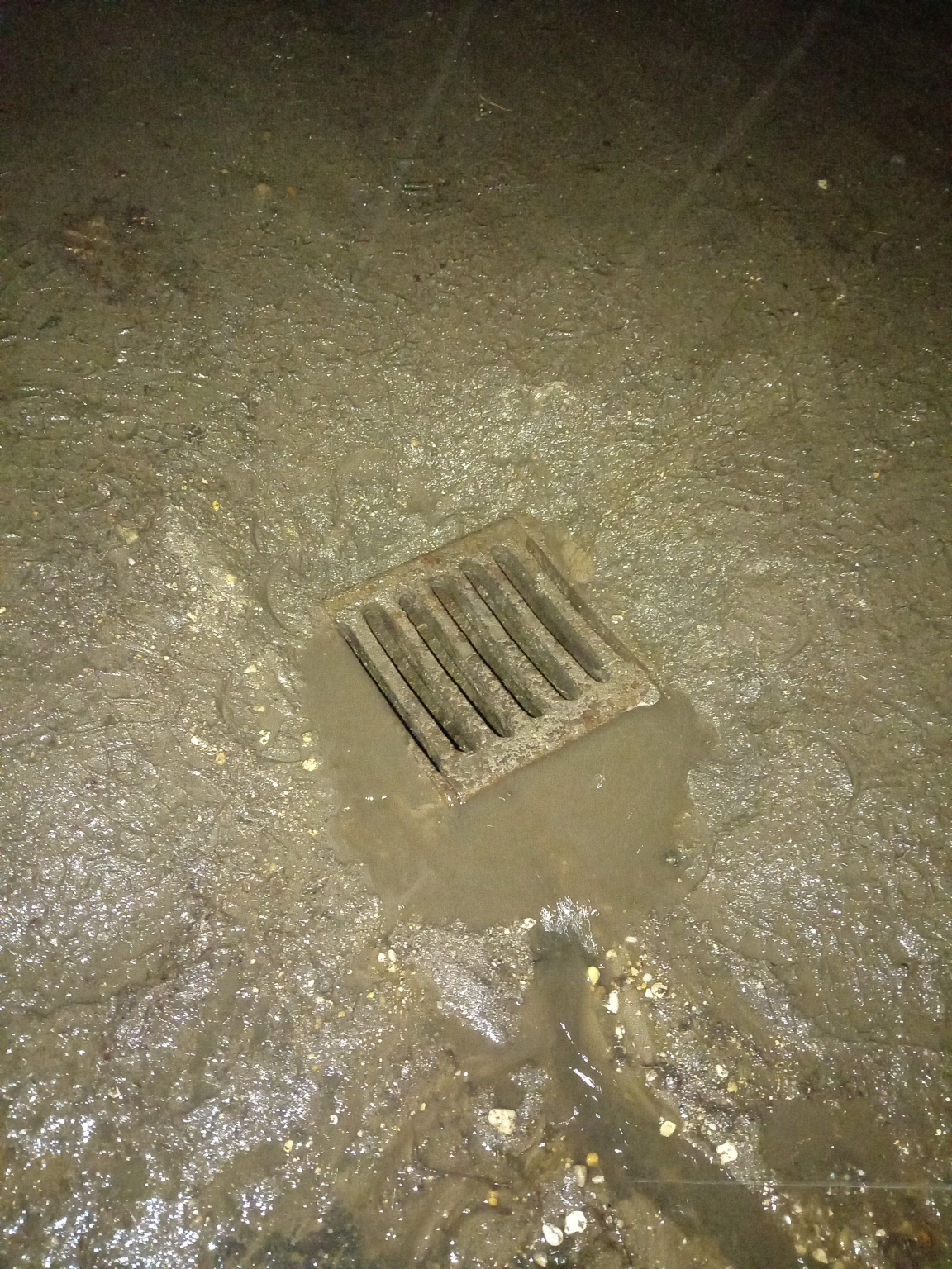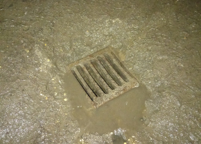 Rosszul kiépitett, esőnél teljesen elduguló csatornalefolyó a parkolóban