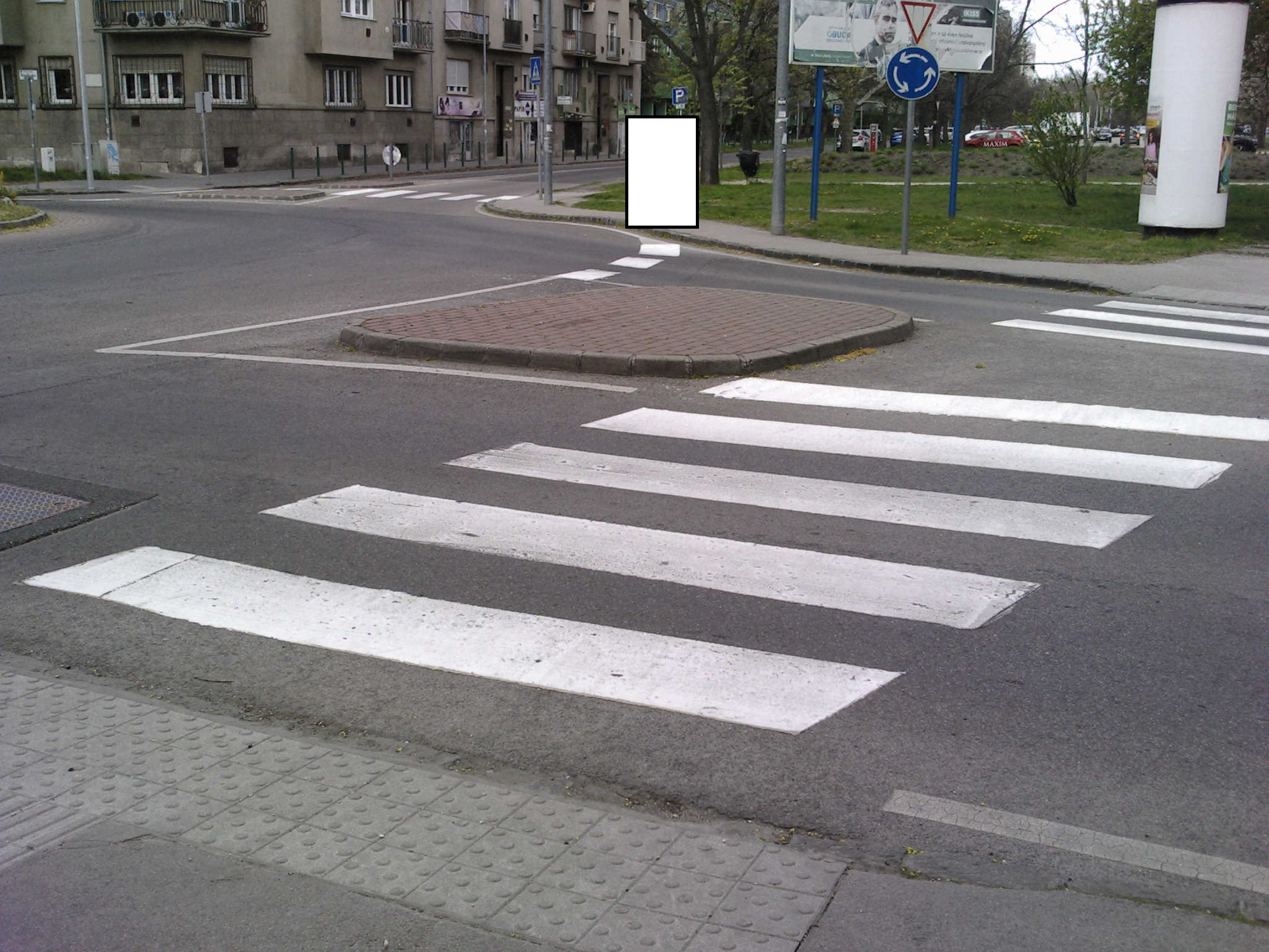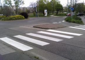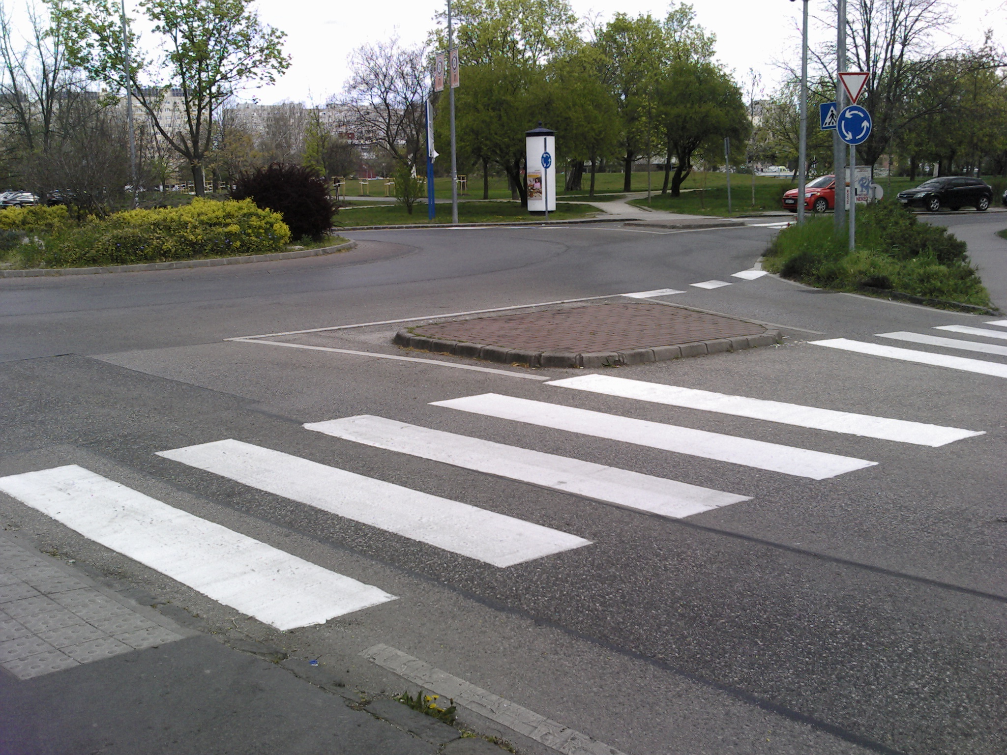 A Budapest III. kerület, Kiscelli-Szőlő utcai körforgalomnál szinte az összes zebra teljesen le van kopva, amiket újra kellene festeni.