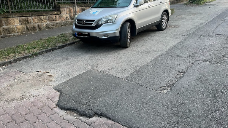 Kátyú a fekvőrendőr mellett