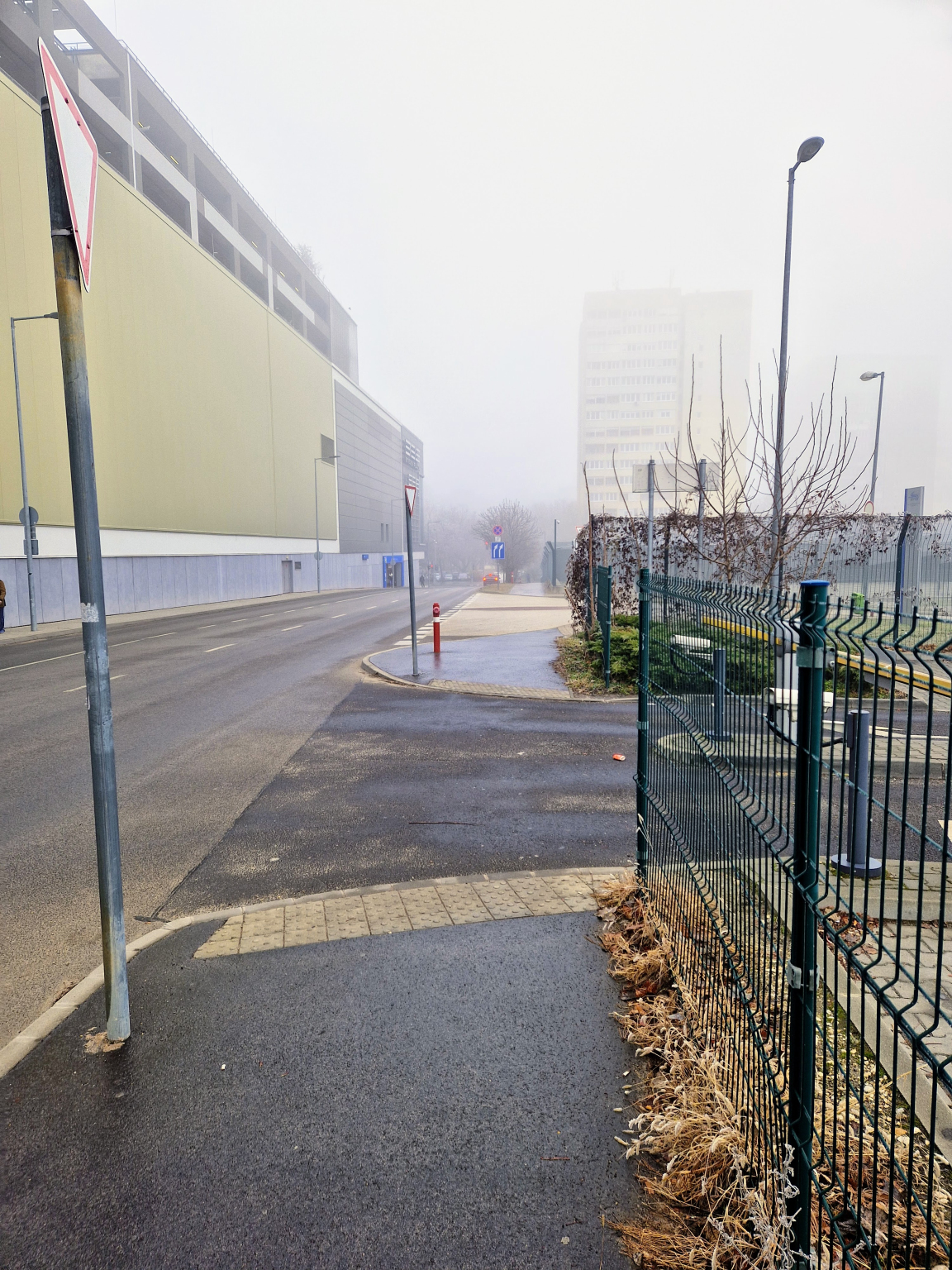 (Jó volna egyúttal fej fölé emelni az úttorkolat másik oldalára kitett két hasonló nyilat is, bár ezek nem a járda fölött, csak mellette vannak.)