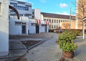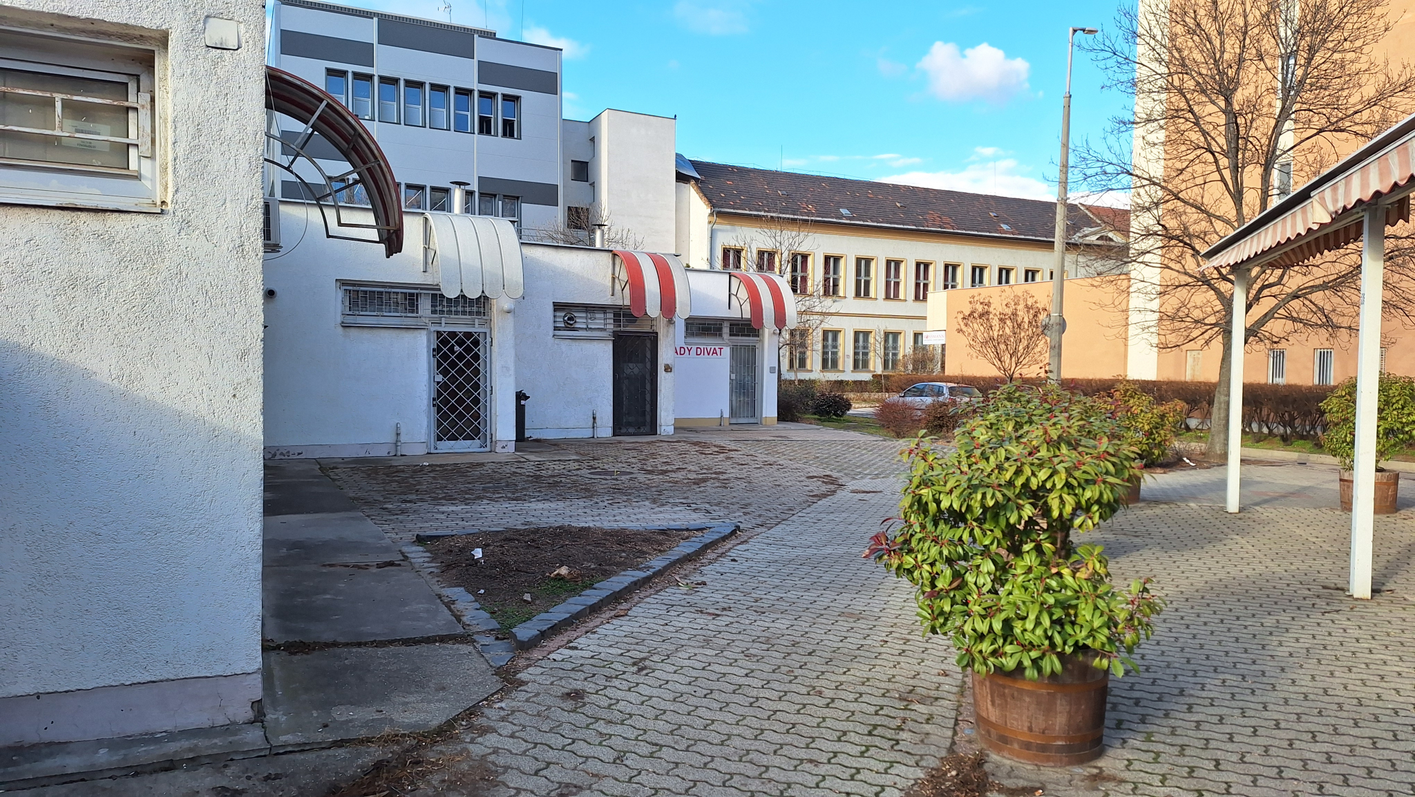 Az Aldival szemközti pavilonok között áll két kiszáradt fa.