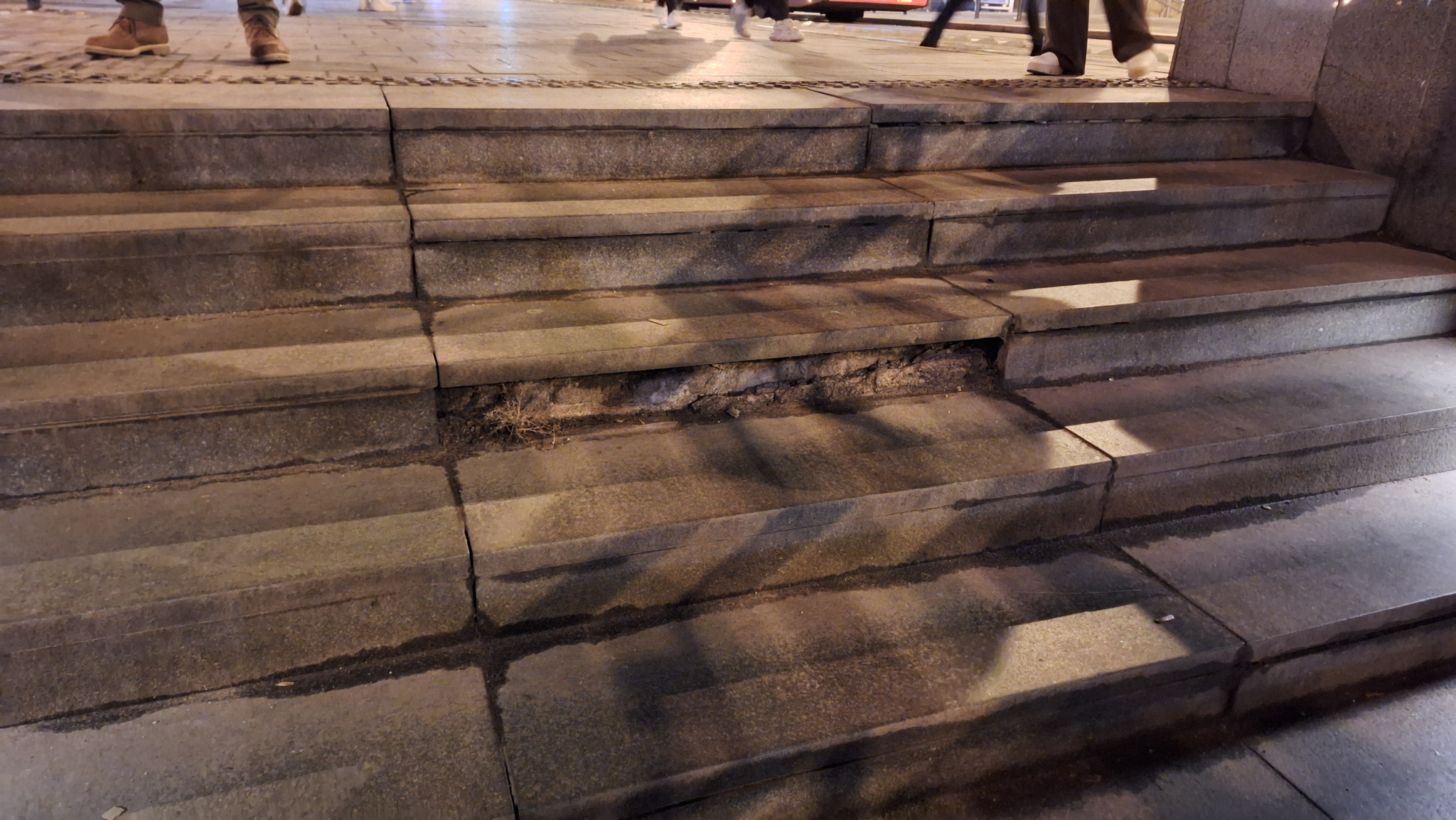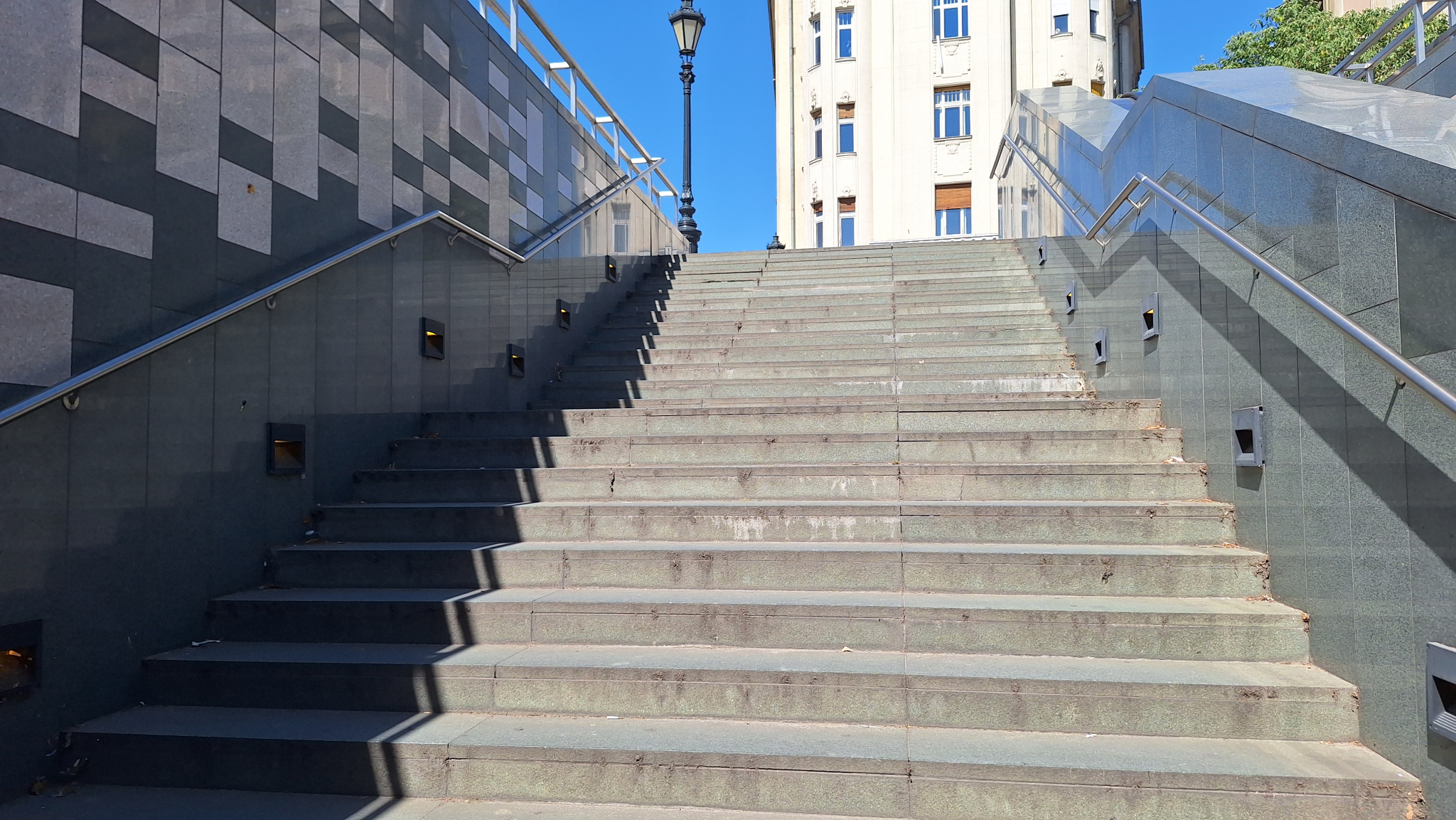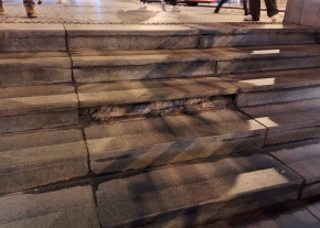 A Fővám téri aluljáró ,,A" lépcsőjének több vízszintes és függőleges lapja is kimozdult a helyéről, jelen állapotban nem kicsit veszélyes.