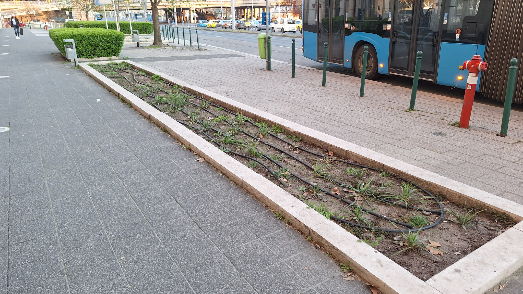 A Közraktár utca 30. előtti virágágyás, és a mellette lévő három növényláda teljesen üres.