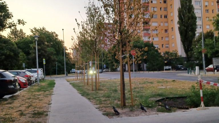 A pár hónapja befejezett parkolófejlesztés miatt ültettek 5 db fát a sarokra. Sajnos a locsolásuk elmaradt, így kipusztultak. Kérjük majd a pótlásukat! Köszönjük! A projektet Óbuda-Békásmegyer Városfejlesztő Nonprofit Kft végezte el, így ők az illetékesek.