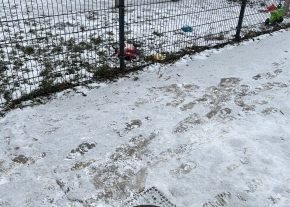 A járda amúgy is járhatatlan, szét van törve, de most már úgy benőtte a gáz, hogy csak az úton lehet eljárni. Itt kanyarodnak a kocsik, így gyerekekkel különösen veszélyes. (a mellette lévő ház lakatlan, így onnan senki nem nyírja.