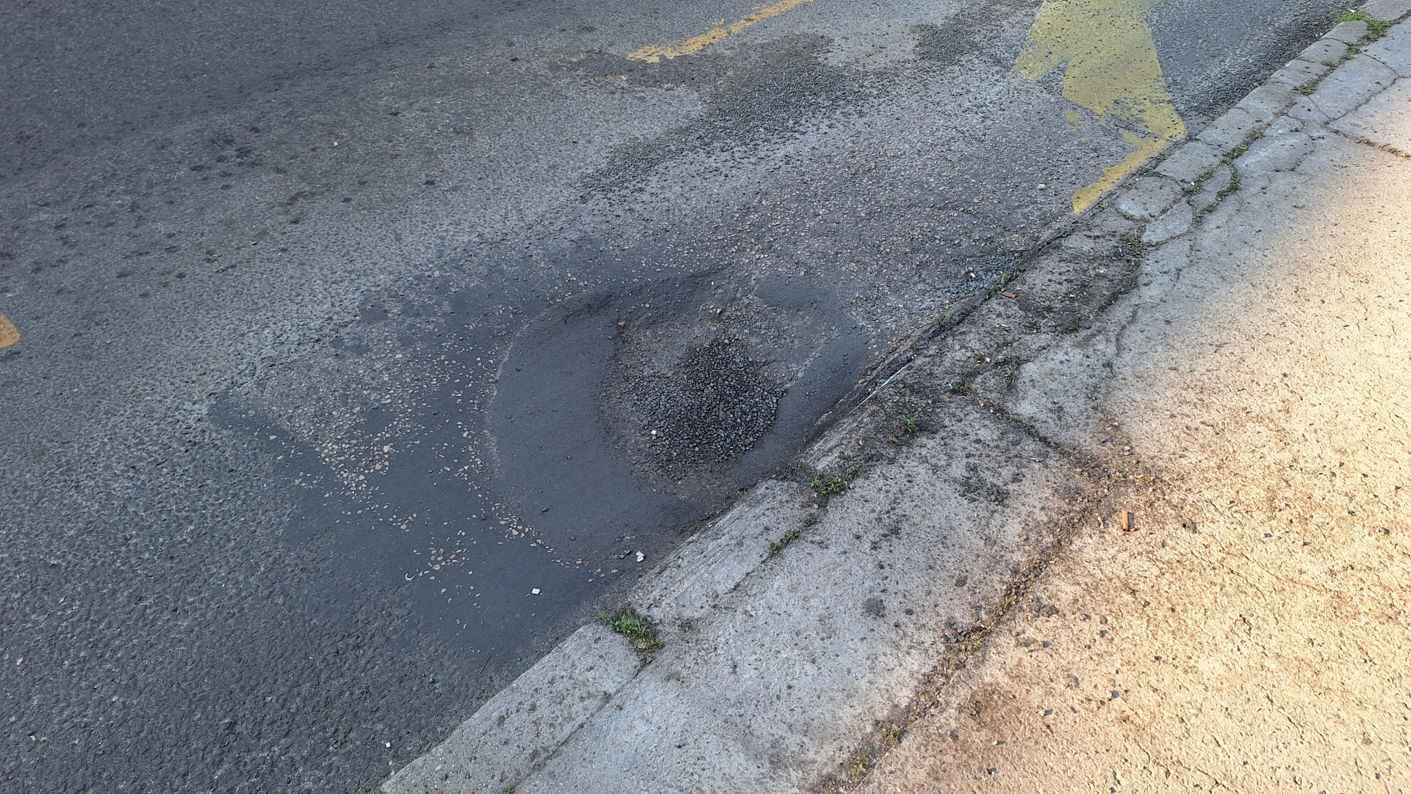 Látszik hogy a kátyút már próbálták foltozni, de ez a buszok forgalma mellett nem tűnik hatásosnak.