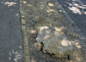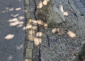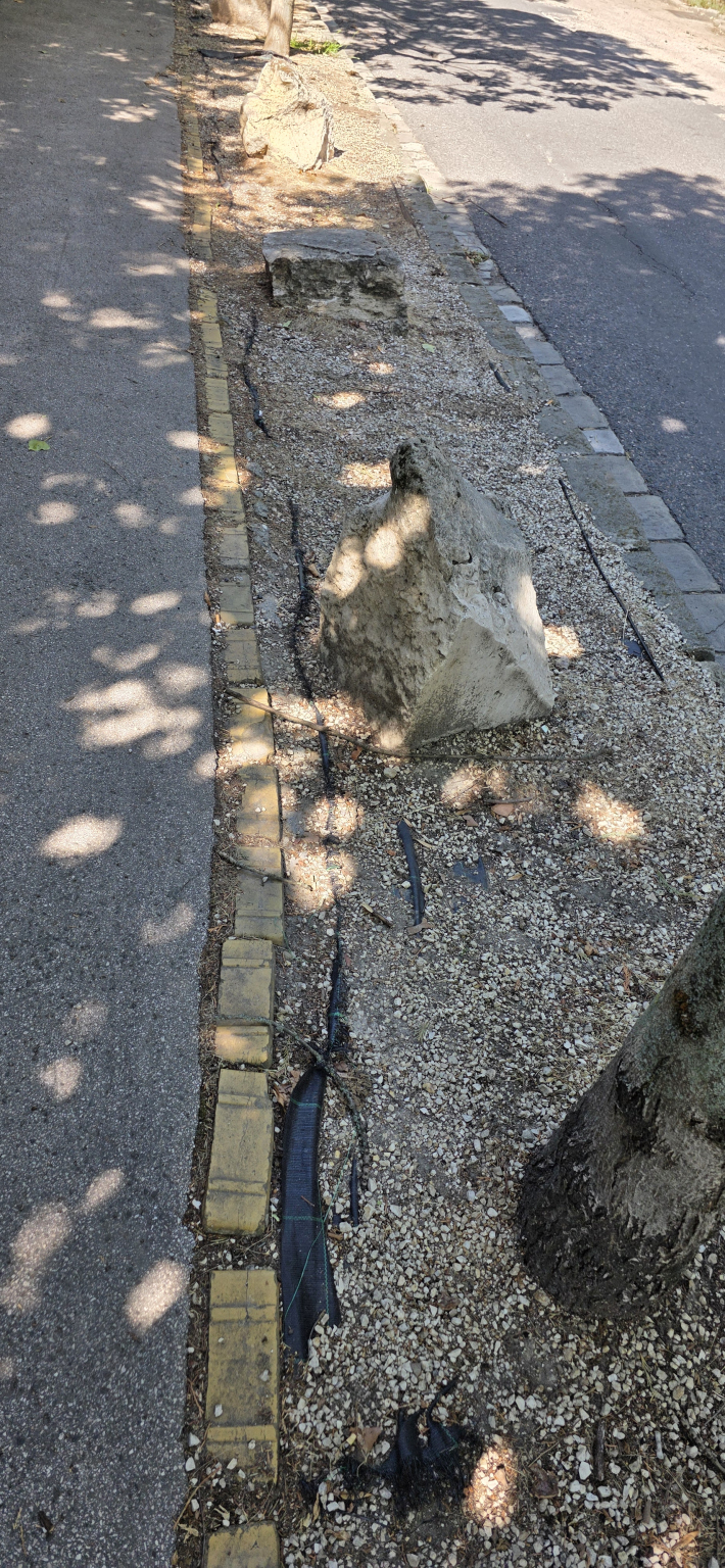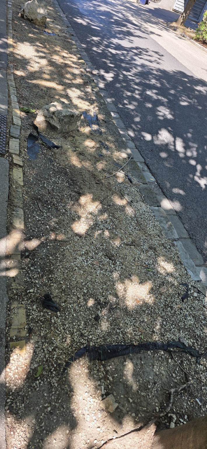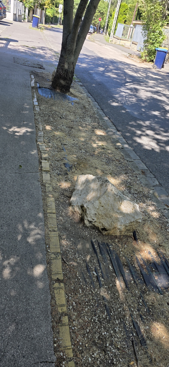 "A Hankócuy utca elején, a Ruszti úthoz közel eső lakópark előtti -régebben füves- területet kaviccsal felszórták, fekete fóliával takarták, hogy magja se maradhasson a zöldnek és szikla darabokkal tették ékesebbé a fák közötti területeket. A sziklákat a kutyák szennyezik, a kisgyerekek pedig előszeretettel tapogatják. Ez nem zöldövezet, ami itt van. Nagyon reméljük, hogy sikerül valamilyen, ennél elfogadhatóbb, zöld felületet visszakapnunk. Előre is köszönjük a segítséget."