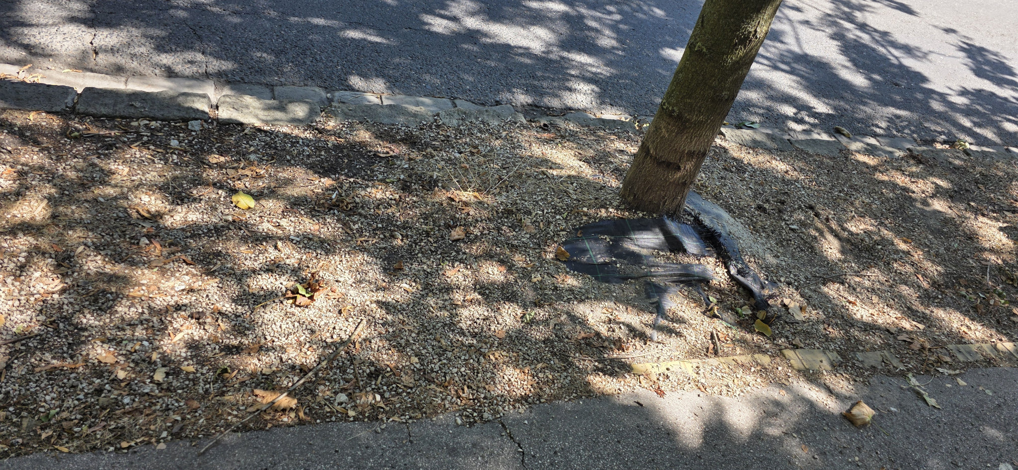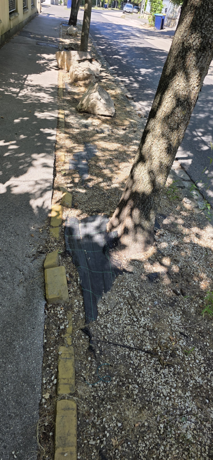 A korábbi zöld terület minősíthetetlen állapota. A zöld terület műanyag fóliával letakarva, kaviccsal beszórva, kisebb 'sziklákkal' színesítve. Ez nem a zöld övezetbe illő megoldás. Nézd a google térképet.