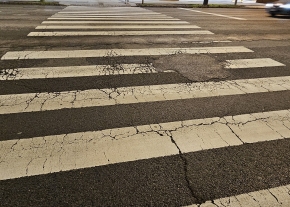 Balesetveszélyes a gyalogátkelő, mert van egy óriási kátyú rajra.
