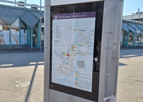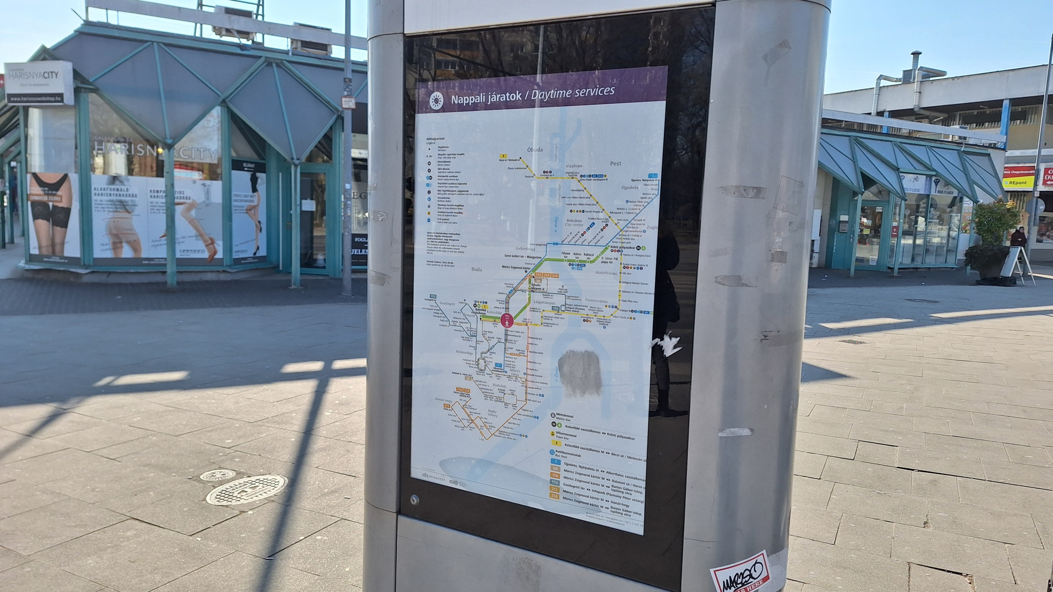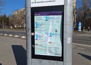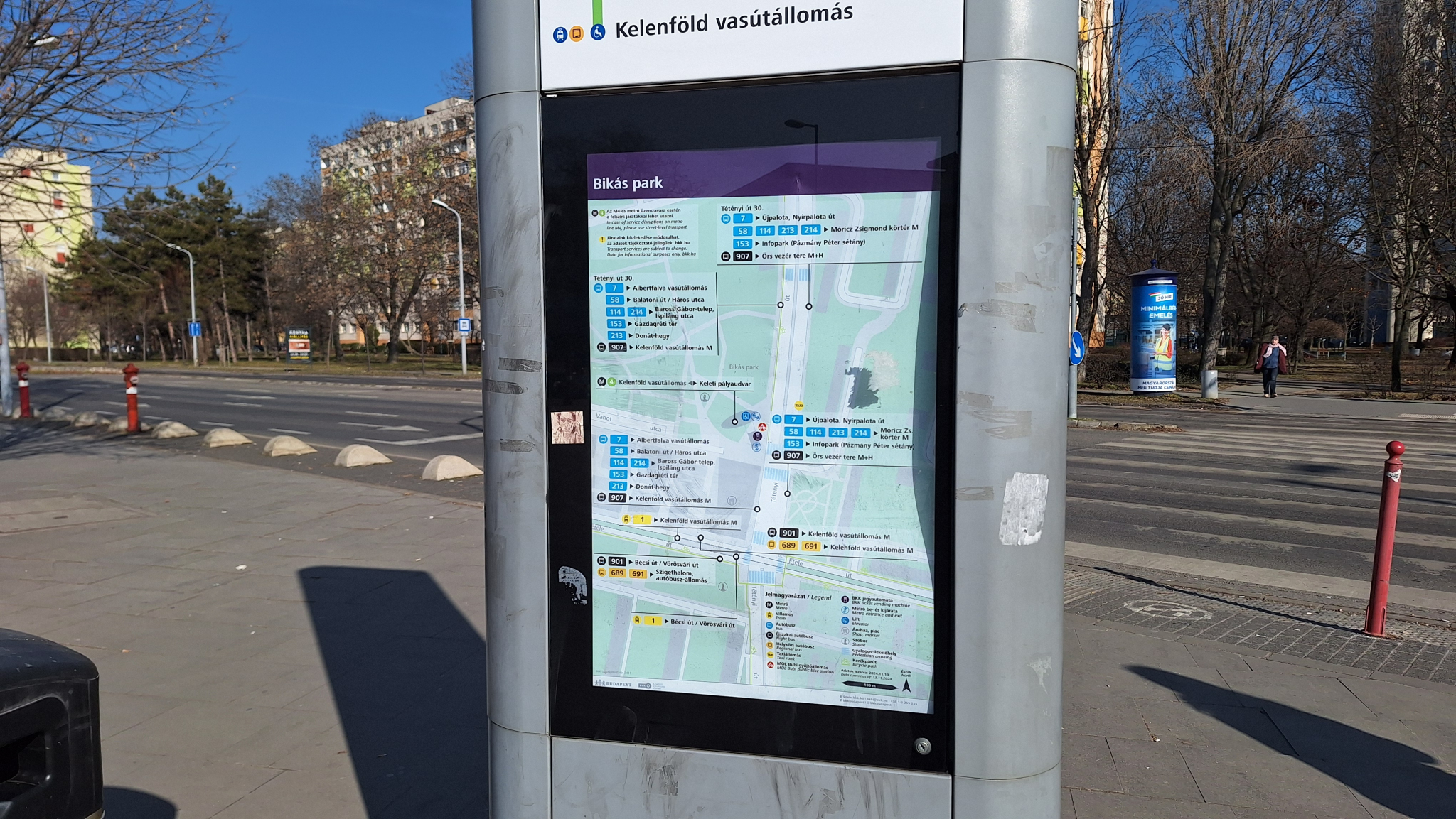A 4-es metró Bikás park állomása előtt a felszíni tájékoztató tábla egyik oldala bebarnult, a rajta lévő térkép megfakult, illetve az egész oszlop tele van ragasztgatva.