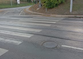 A Tavas utcai vonalon a 117 es vonalán a csatornafedlap lassan útban süllyedés látható.