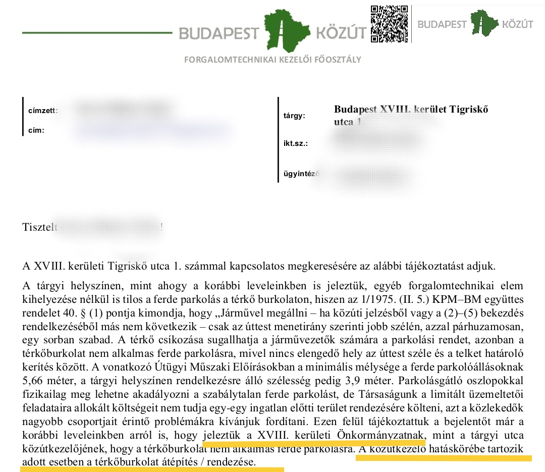 A Budapest Közút a korábban csatolt válaszában leírta, hogy a probléma megoldásában nem ők az illetékesek, hanem a XVIII. kerületi önkormányzat, ezért úgy véljük, a Budapest Közútna...
