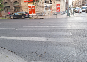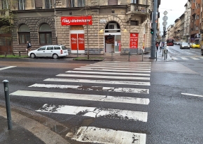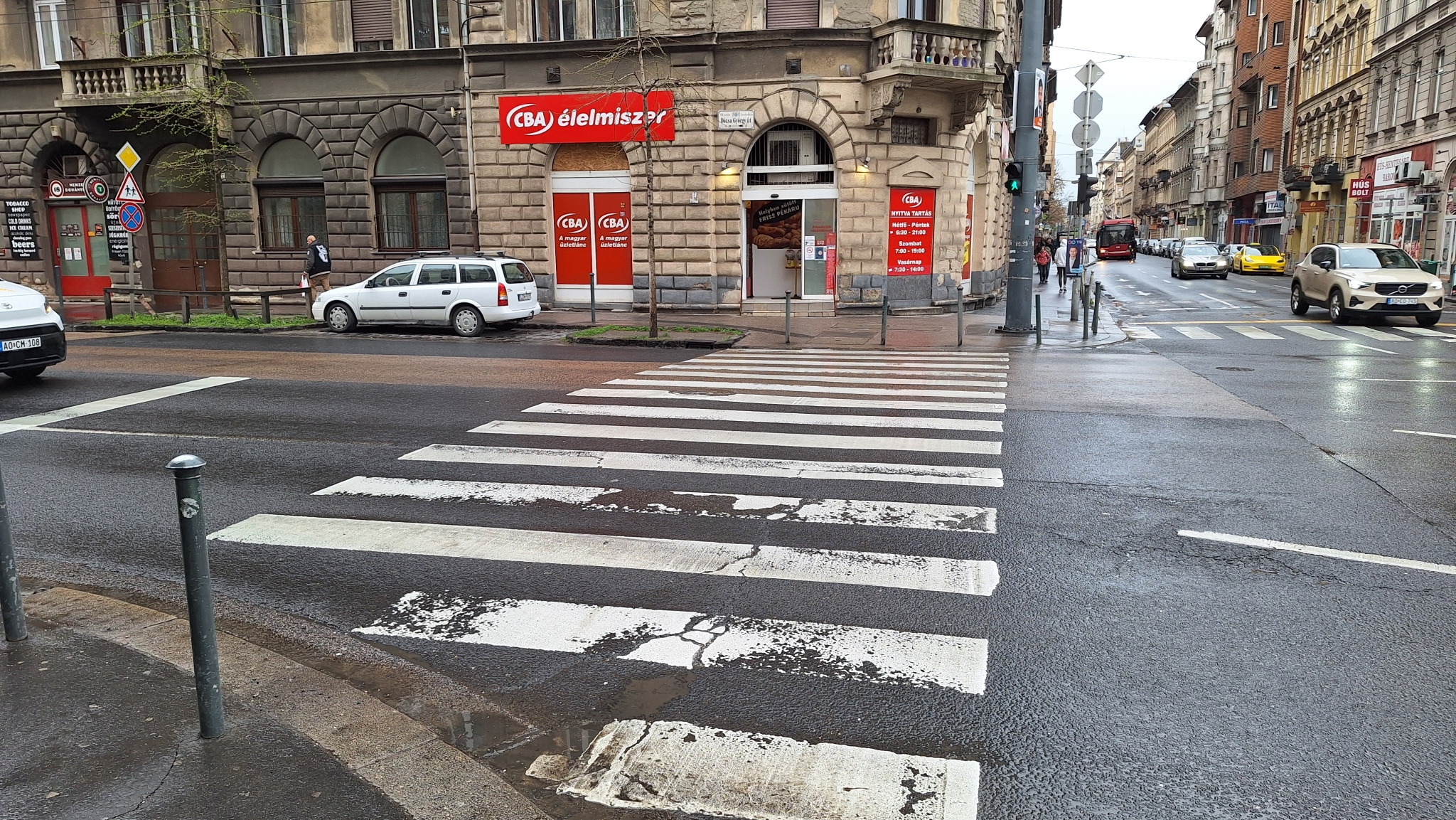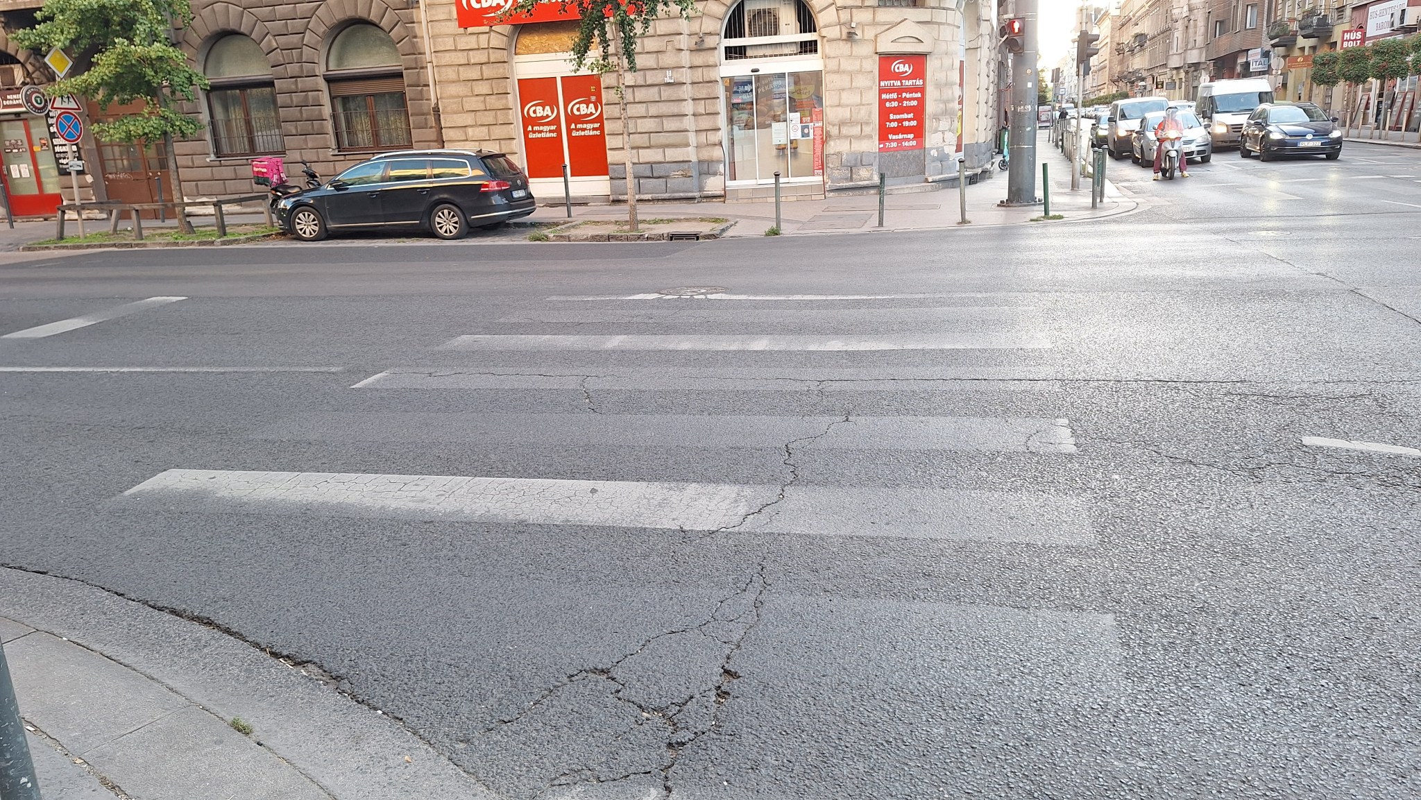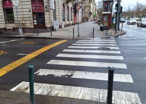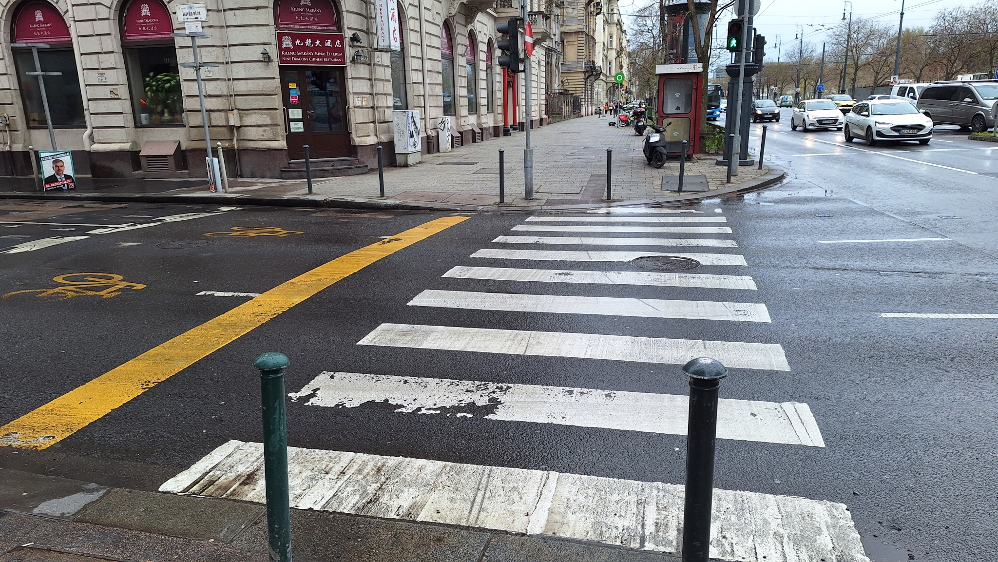 A Dózsa György út és az István utca kereszteződésénél lévő zebrák erősen meg vannak kopva.