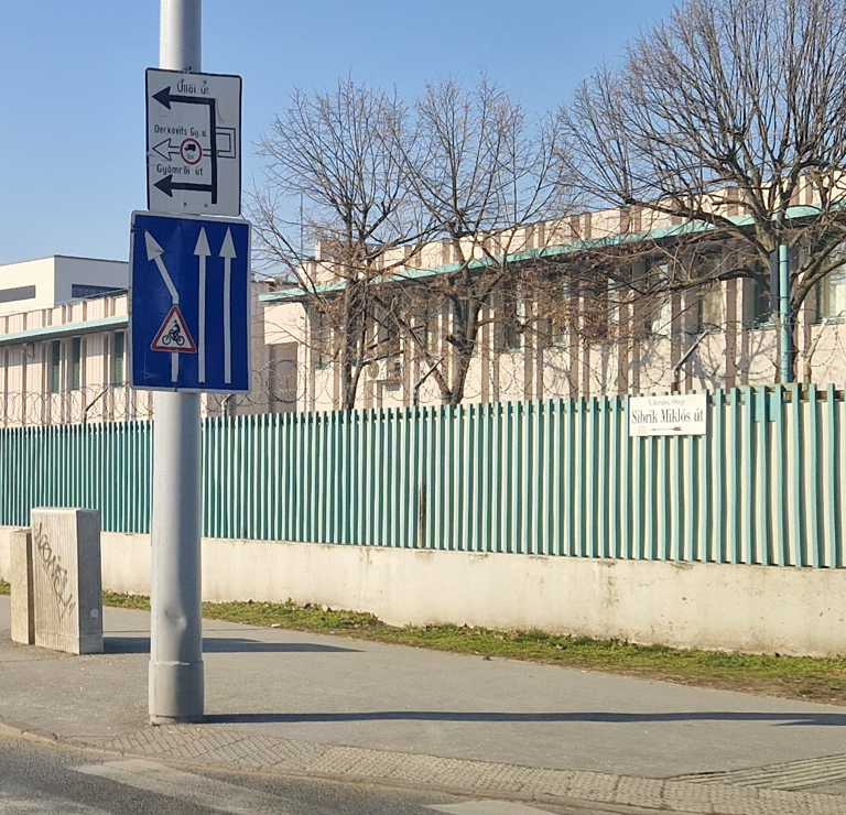 A Sibrik Miklós útnál buszmegálló felé a közúti táblák mind a két rongálás látható.