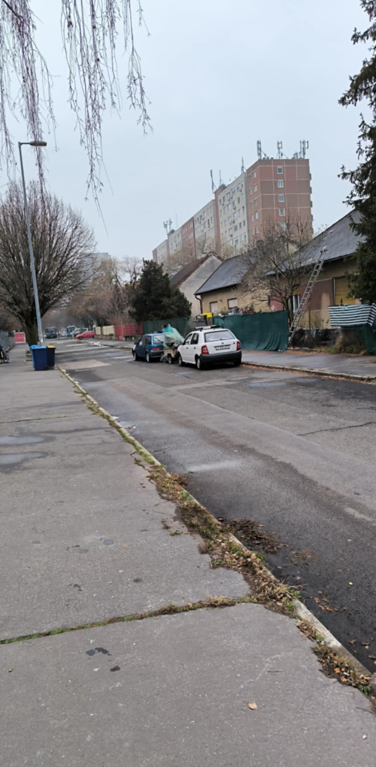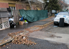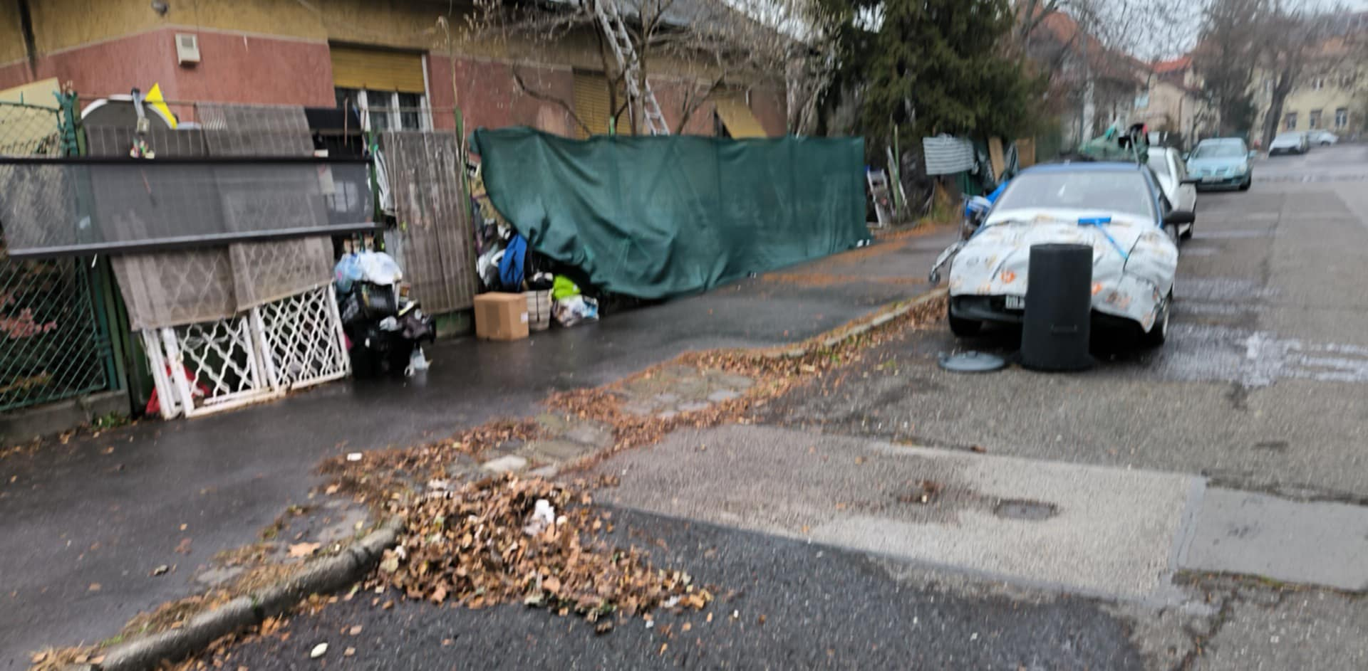 Újbuda Kenderes utca szakaszán a járdán a 7. szám előtt végig van pakolva mindenféle hulladékkal.
