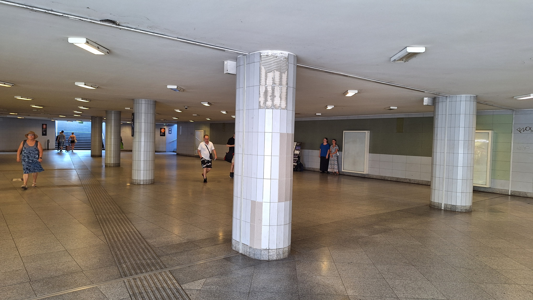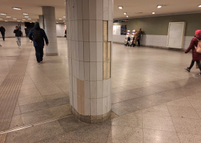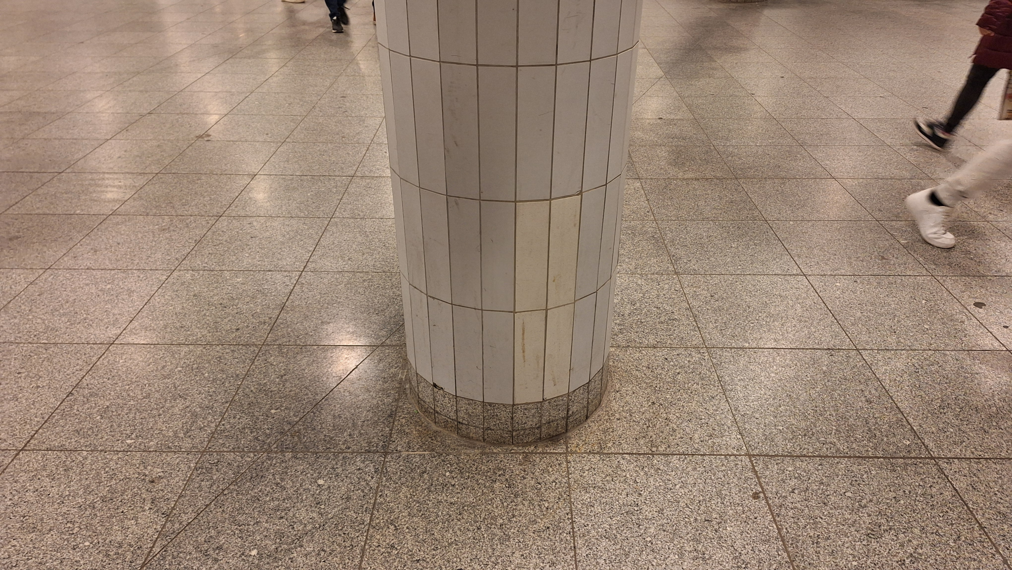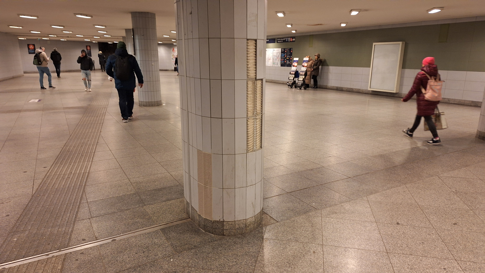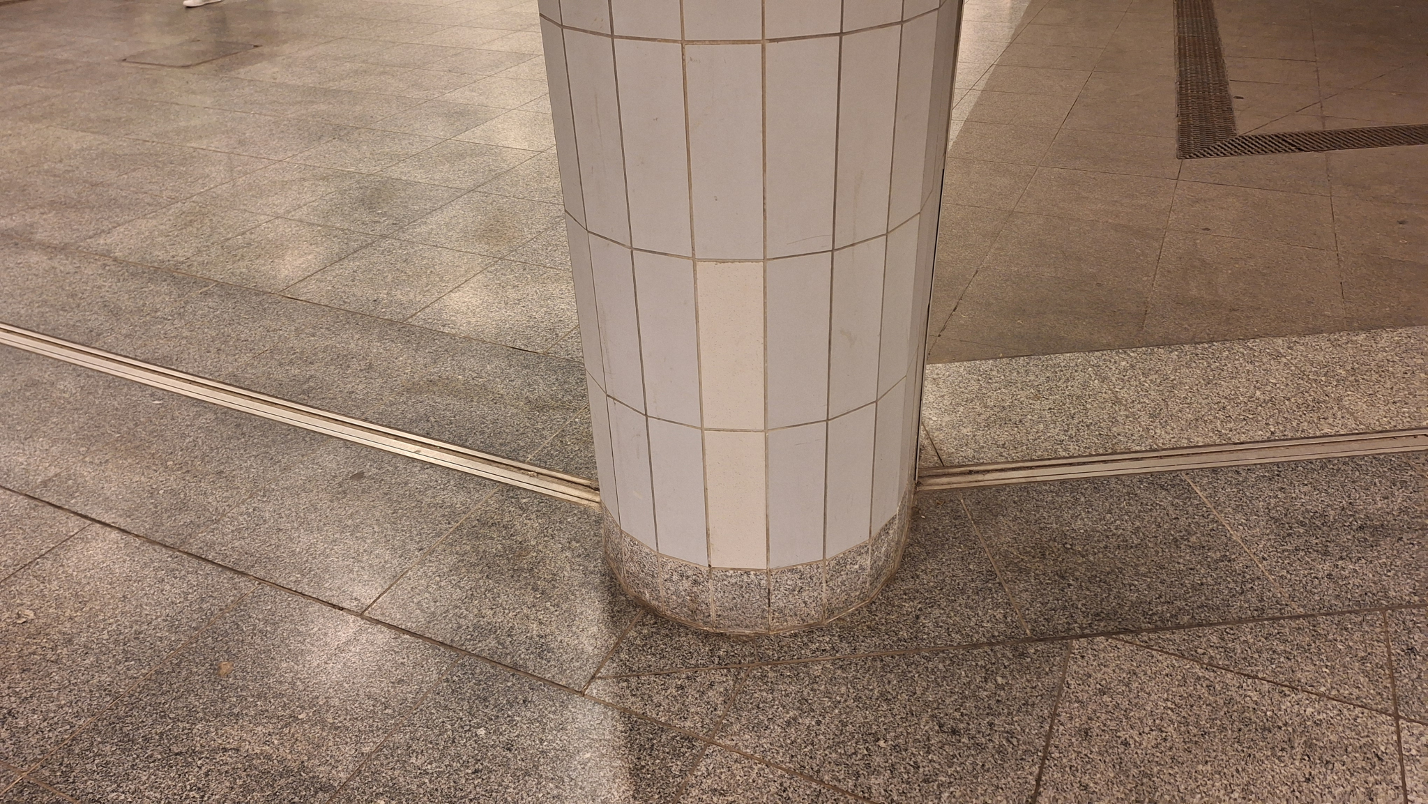 A Keleti pályaudvar aluljárójában a 4-es metró bejáratánál több oszlopnak is leesett a csempeburkolata.