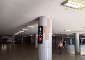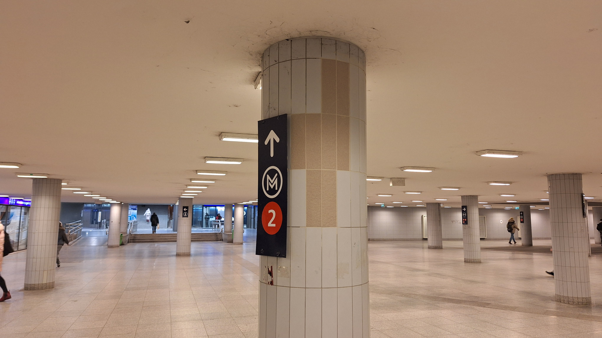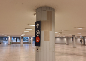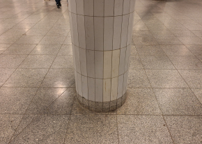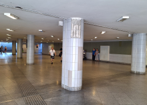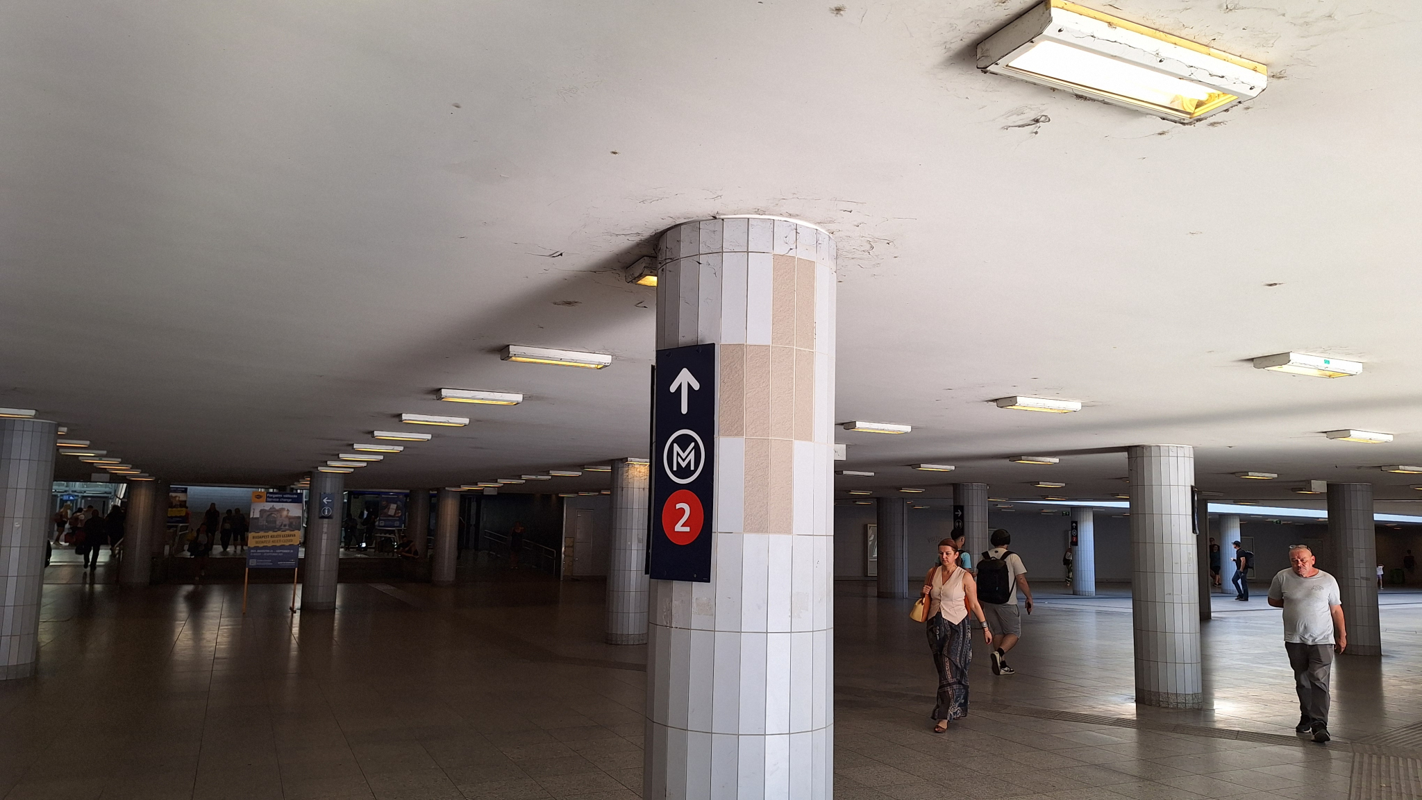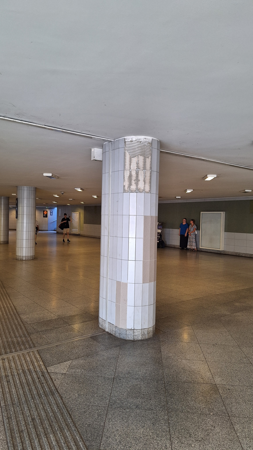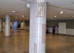 A Keleti pályaudvar aluljárójában a 4-es metró bejáratánál több oszlopnak is leesett a csempeburkolata.