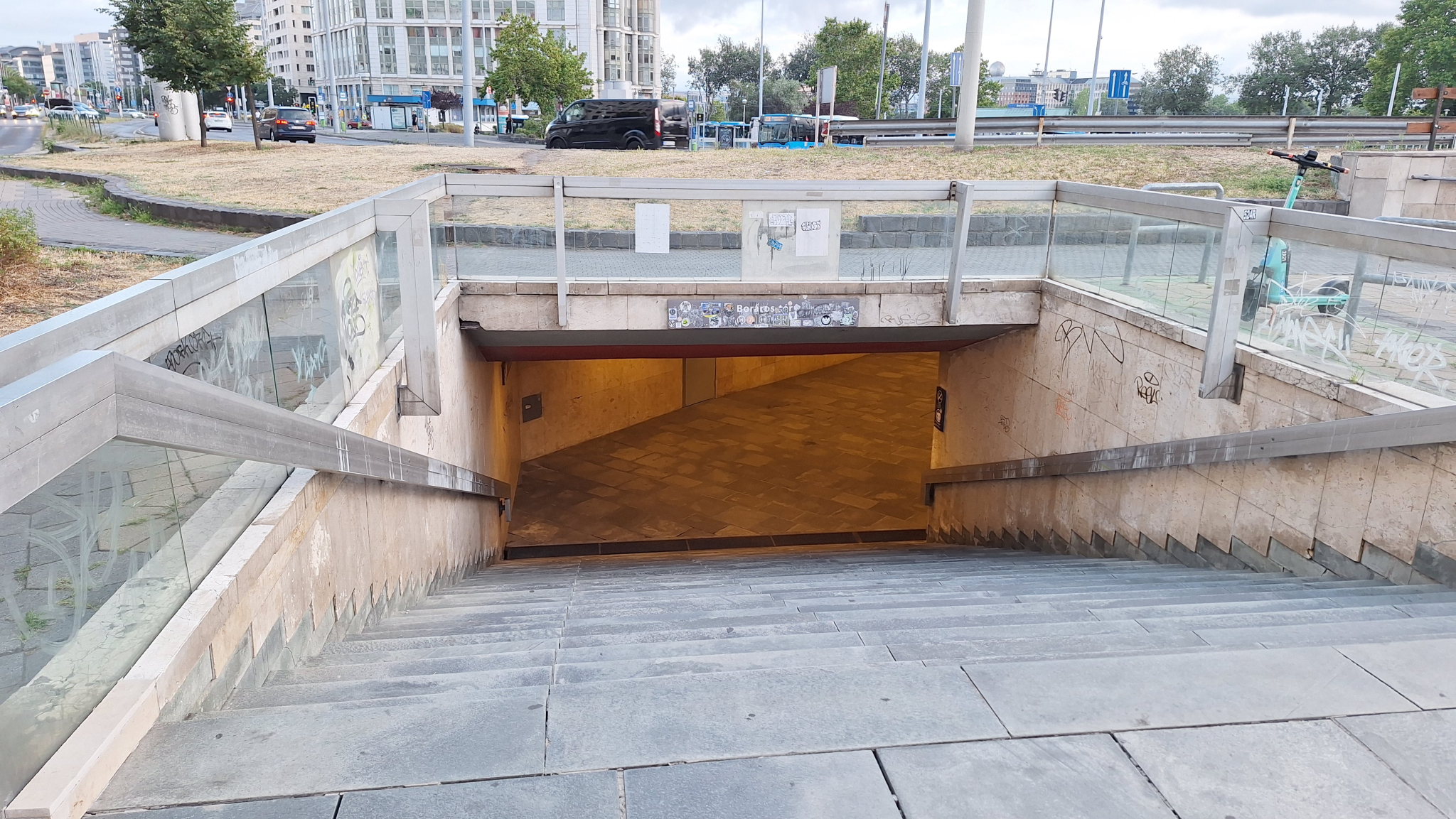 A Boráros téri aluljáró ,,A" ,,B" ,,D" ,,F" és ,,L" jelű lépcsői, korlátai, tájékoztató elemei szanaszét vannak firkálva, matricázva.