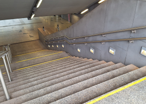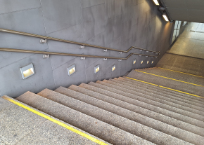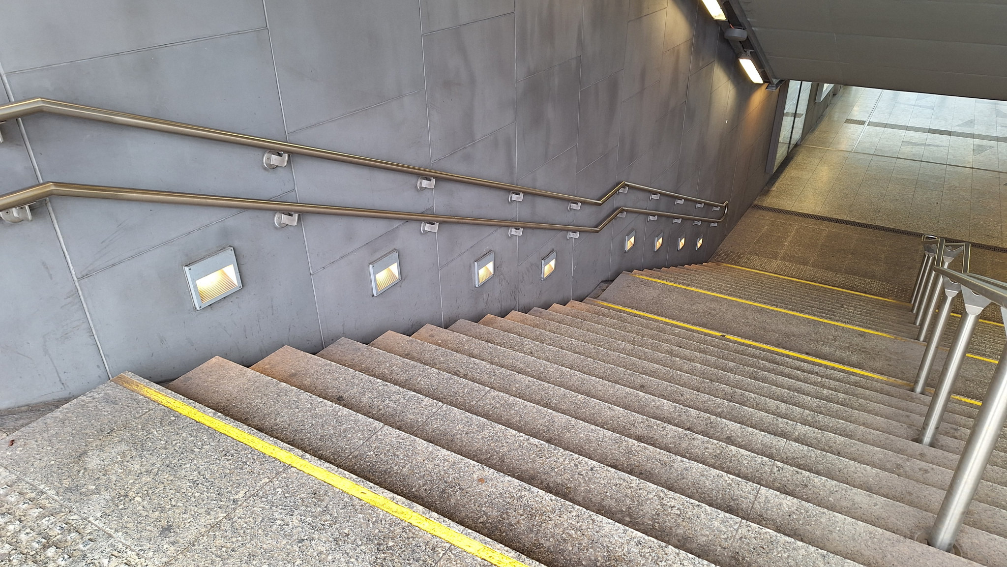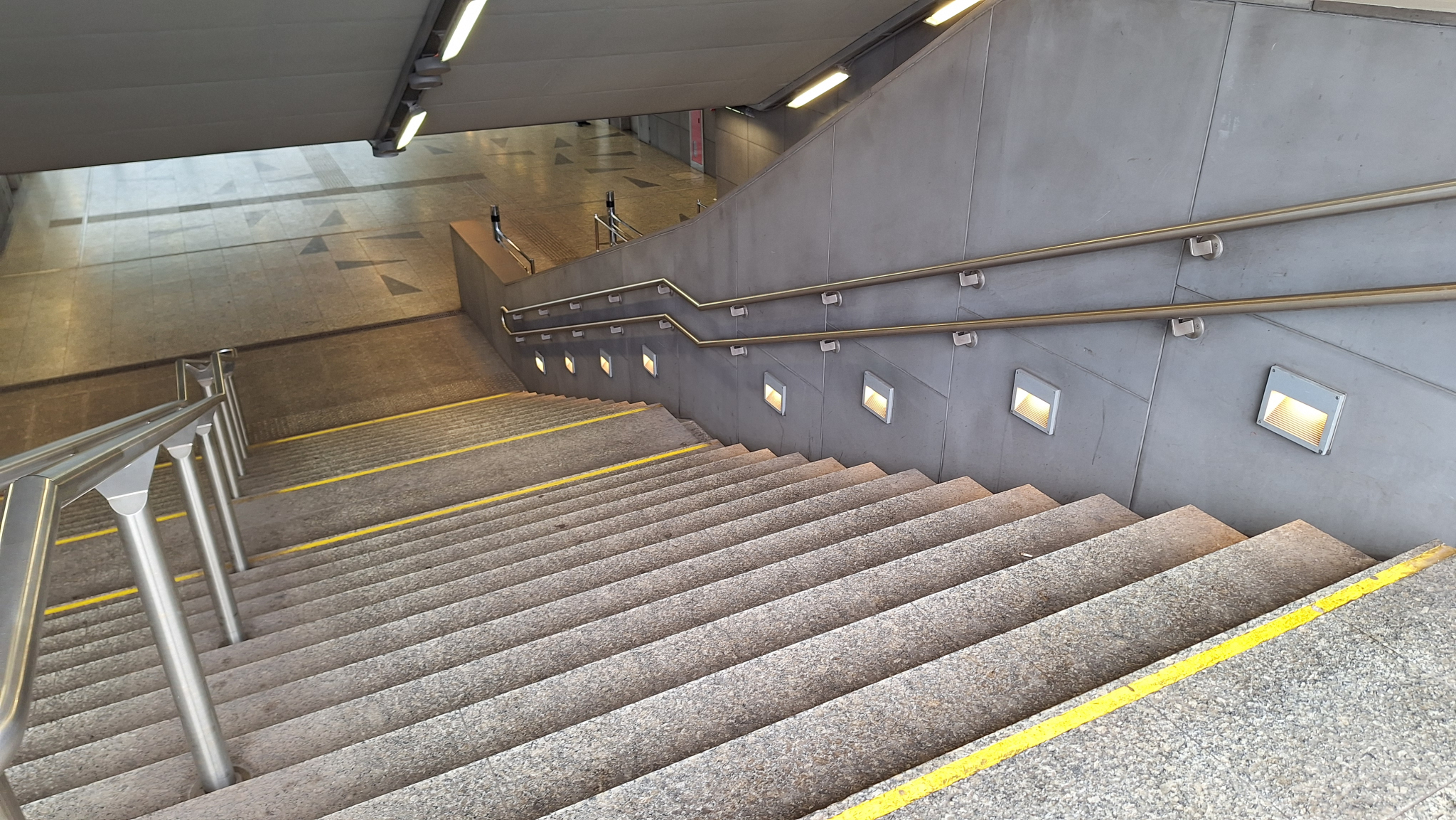 A Bikás park metróállomásra levezető lépcsősor lámpáinak többsége nem ég.