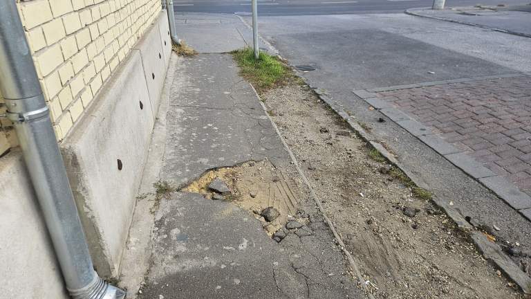 Évek óta figyelgetem nőni ezt a kátyút. Örülnék ha betömnék végre. Amúgy is keskeny a járda és boltás vedzélyes, este alig látni. Garay utcában van közel az üllői sarokhoz az épület melett.