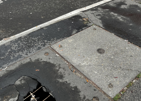 A képen látható fedlap fém keretét megette a rozsda, ezért a fedlap billeg és a fedlap szélénél is pár cm rés van. Egyrészt balesetveszélyes lehet, másrészt az aknába belefolyhat az esővíz.