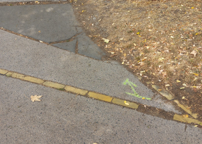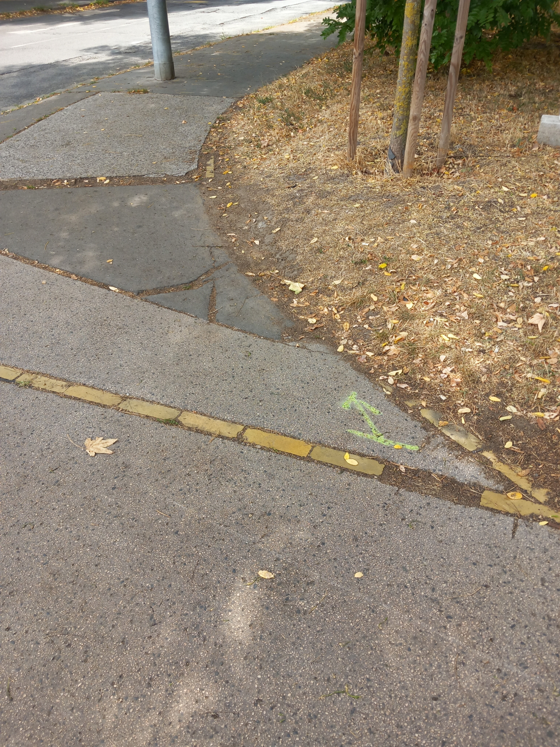 A Harmat utcai csomópontól a Tavas utcai jobbra kanyar tól bekezdéstől egészen az utolsó képen a szőlővirág utca között bejárata között jobboldalt a járdákon újabb keletkezés és töredezettség látható, + csúnya hézagok vannak ezen a járda burkolaton