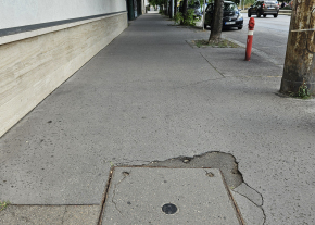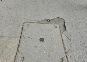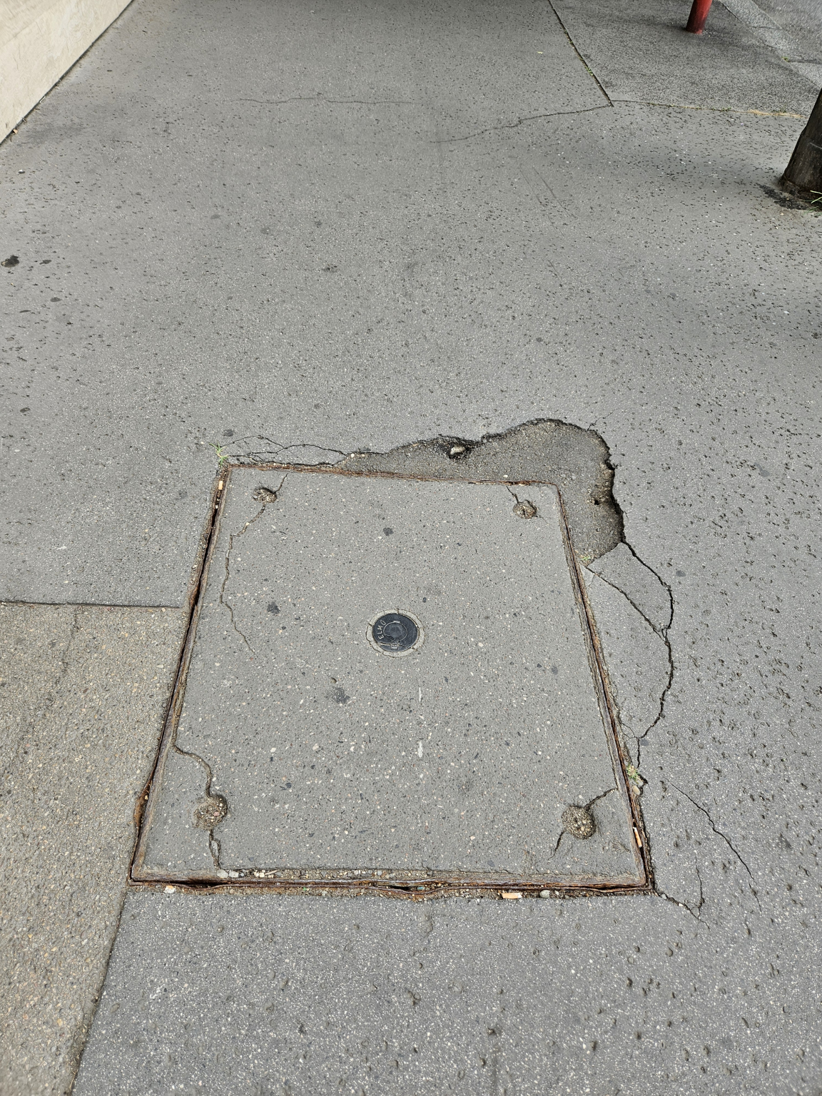 A Közraktár utcán, az ELMŰ fedlap kerete süllyedt, és a sarkánál beszakadt a járda.