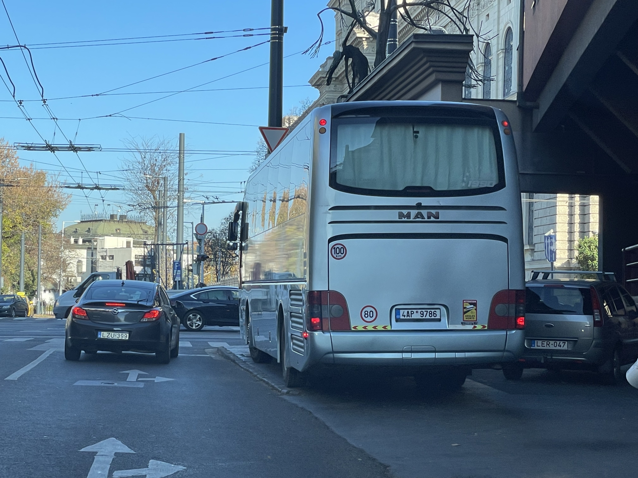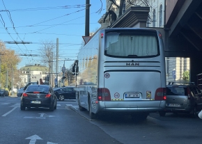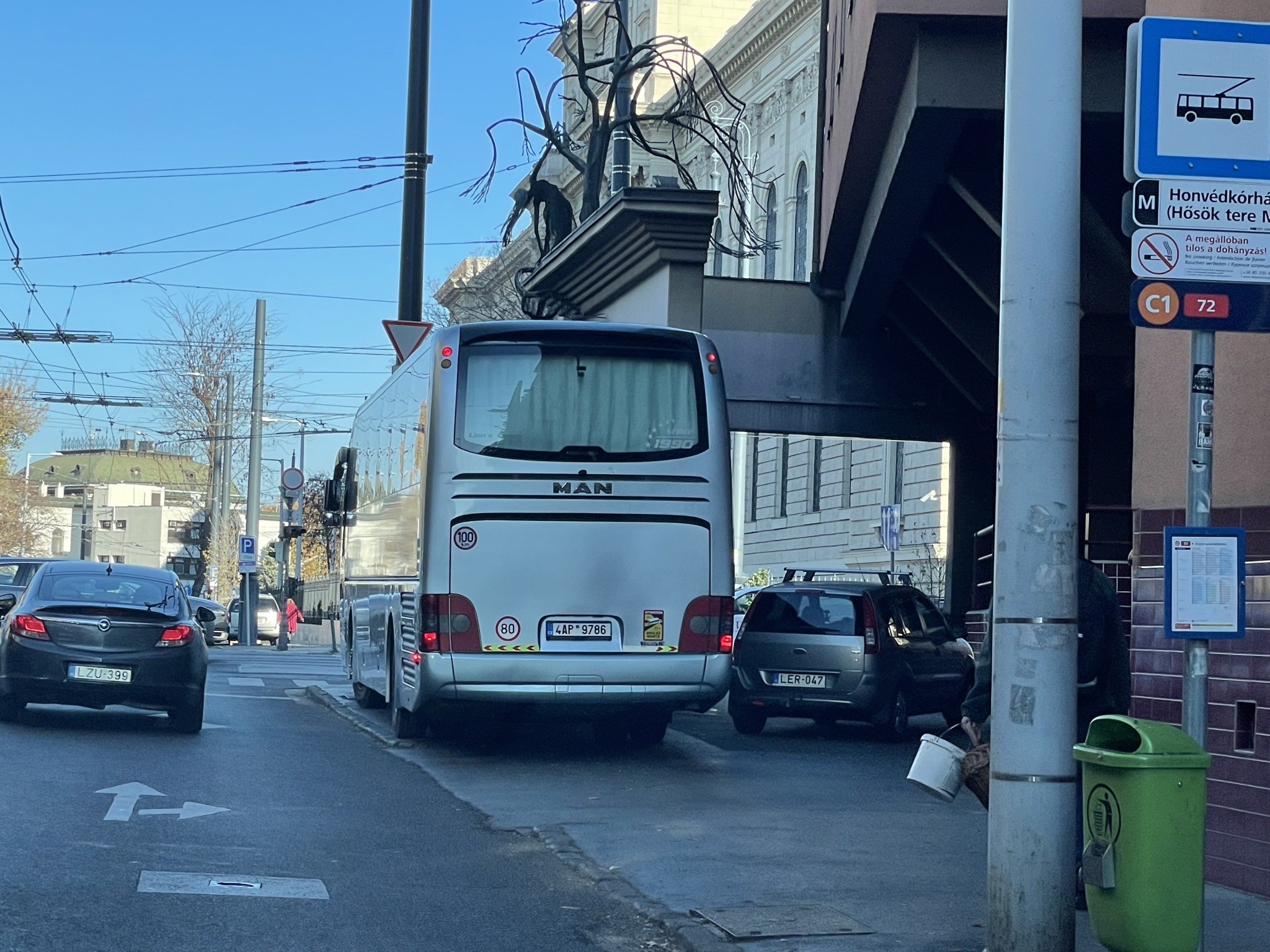 A Szondi utca-Dózsa Gy. út sarkán található szállodába érkező turistabuszok rendszeresen elfoglalják a járdát szinte teljes szélességben. Most hagyták egy kis helyet, ahol én és a kutyám elfértünk, de a kerekesszékes lány már nem. Áttoltam a másik oldalra, de akkor is. Milyen parkolás ez, ráadásul a forgalommal szemben, amiért egy autós kerékbilincset szokott kapni.