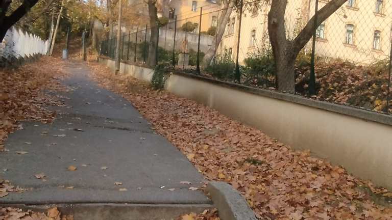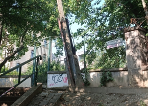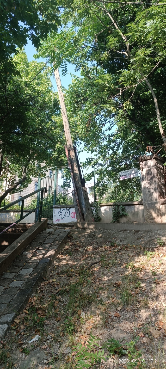 A Bartoniek Géza lépcső sarkánál lévő közműoszlop ránézésre erősen megdőlt és így a kábel is megereszkedett.