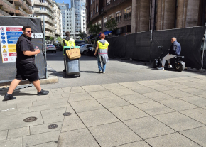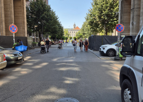 A munkaterületet körülvevő kerítés már kisebb területet határol körül, így a gyalogosoknak nagyobb helyük van közlekedni.