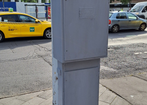 A Dózsa György út M aluljáró B kijáratánál (a rámpánál) lévő oszlop mellett áll egy rozsdás, firkás kapcsolószekrény. Kérem cseréljék le, vagy ha már nincs használatban, akkor bontsák el.