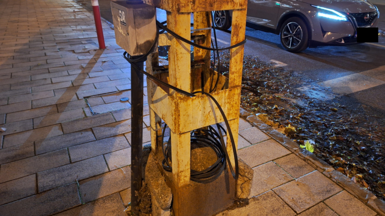 A Dózsa György út és Angyalföldi út sarkán álló felsővezetéktartó oszlopról lóg a kábelezés.