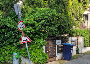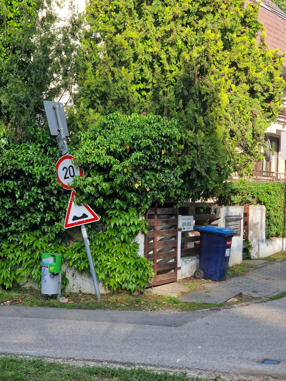 A Németvölgyi út 112. előtt dől a KRESZ táblát tartó oszlop az úttest felé.