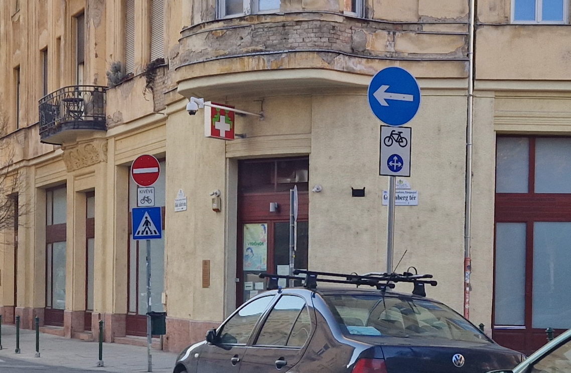 Közlekedési kötelező haladási irány tábla ko-zva a VIII kerületi Gutenberg téren. Javaslom a helyreállítását. Pláne hogy kitett táblával is sokan behajtanak szembe az egyirányú utcába.