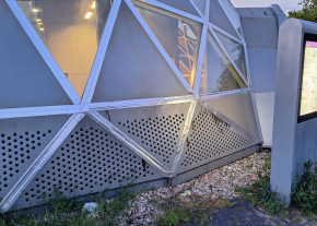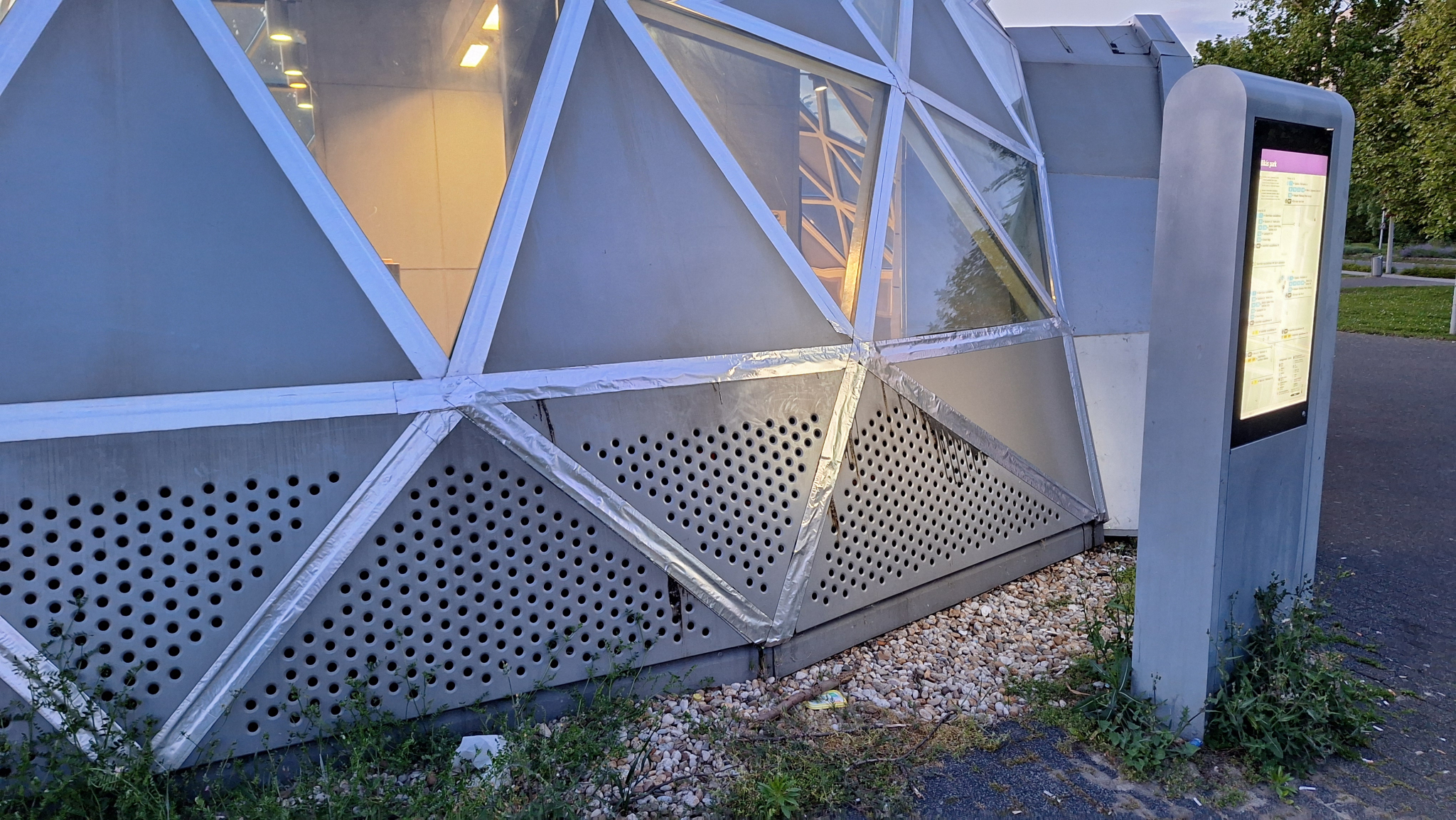 A Bikás park metróállomás üvegkupolájának külső burkolata sérült, az illesztések hiányoznak.