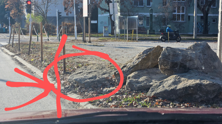 Tudtommal az út közvetlen közelében nem lehet elhelyezni ilyen jármű állapotára fenyegető akadályokat csak 30-50cm távolságban. Kérem beljebb tetetni a tulajjal.