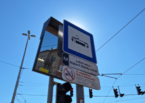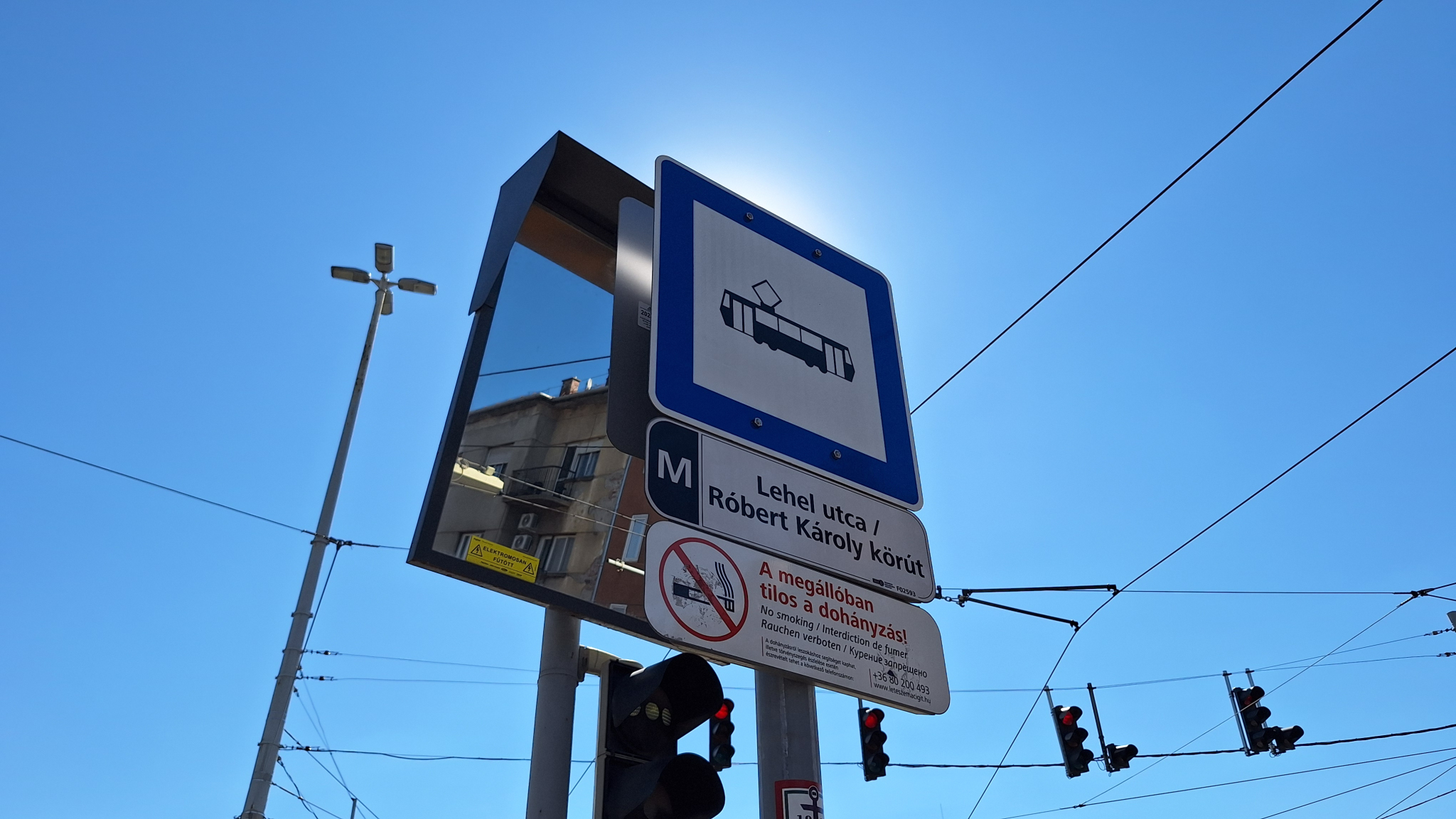 A 14-es villamos Lehel utca / Róbert Károly Körút megállójában tele van matricázva a megállótábla.
