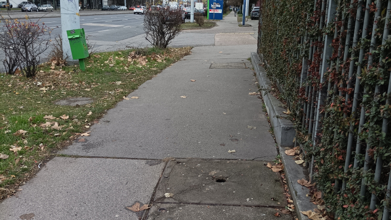 A képen látható aknafedőn nagy lyuk van, a fedlap el van vékonyodva, az aknában már sok a szemét. Vodafone/upc aknafedőkkel van egy vonalban.